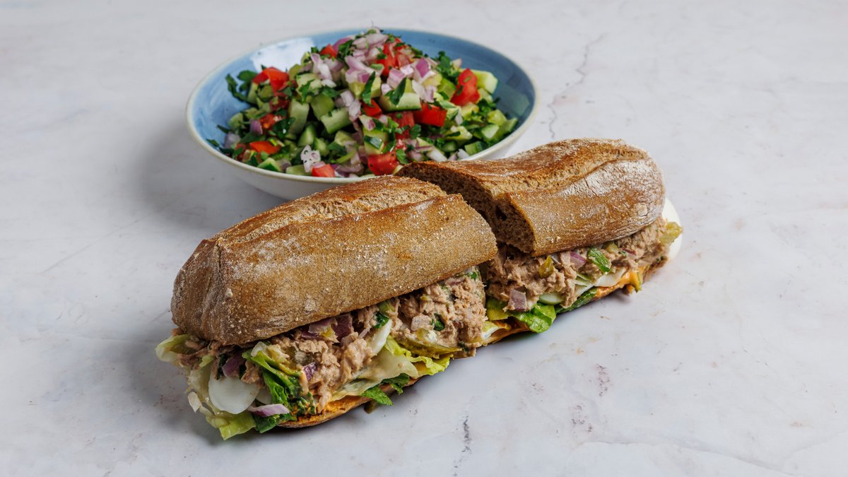 סלט טונה, מלפפון חמוץ, ביצה קשה, בצל סגול, זיתי קלמטה, חסה ואיולי פלפלים