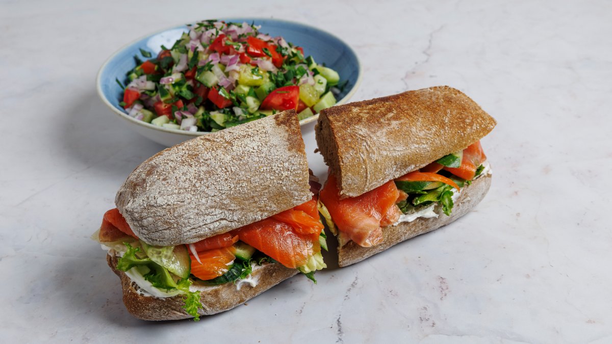 סלמון מעושן, גבינת שמנת, בצל סגול, מיקס חסה ומלפפון ירוק