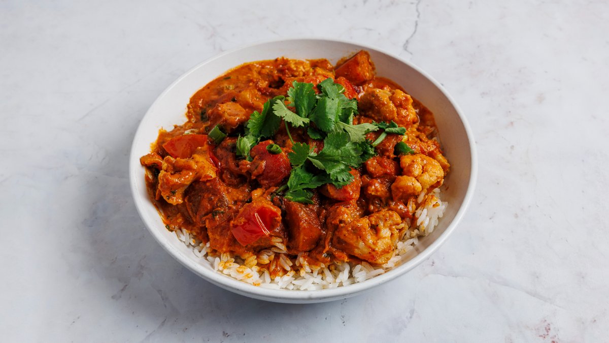פרחי כרובית מוקפצים יחד עם תפוחי אדמה, זרעי כמון, עגבניות וגארם מסאללה מוגש עם אורז/קינואה, בצל ירוק, כוסברה ויוגורט מתובל בצד