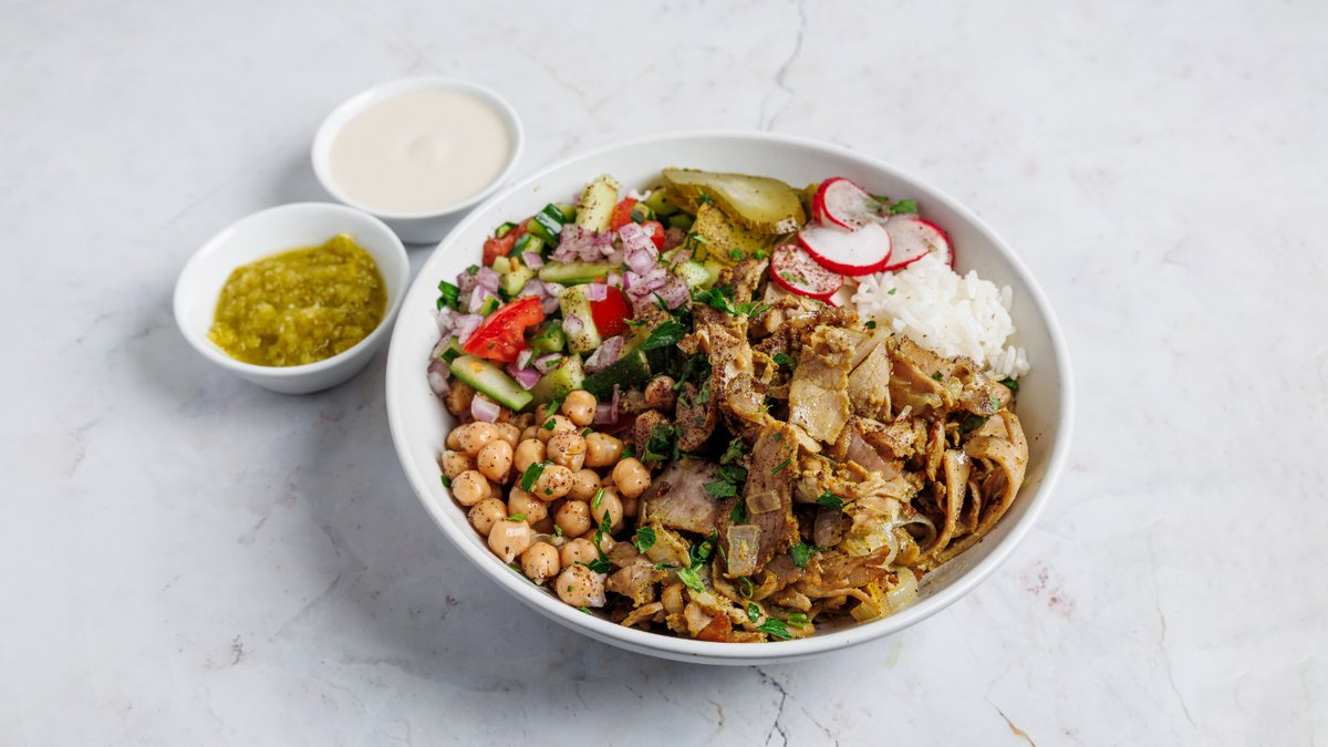פרגית / טופו מוקפצים בתערובת תבלינים ובצל מקורמל מוגש עם תוספת לבחירה, סלט ירקות ועשבי תיבול, גרגירי חומוס, בצל סגול, מלפפון חמוץ, צנוניות, תטבילה פיקנטית ורוטב טחינה בצד