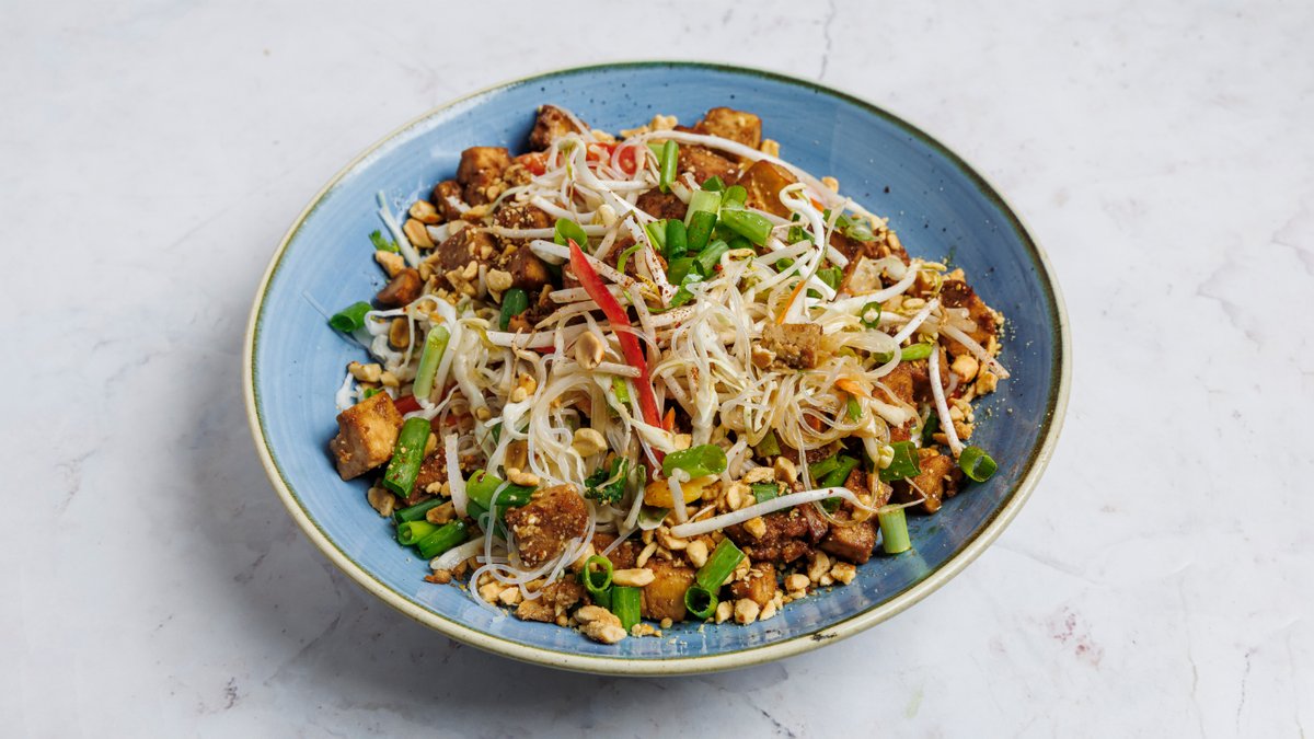 עוף/טופו מוקפצים בשמן שומשום, אטריות שעועית, כרוב, גזר, פלפל אדום, עגבניות שרי, סלרי, נבטים, בצל סגול, בצל ירוק, כוסברה, נענע, פלפל שאטה ושברי בוטנים ברוטב סאטה אסיאתי