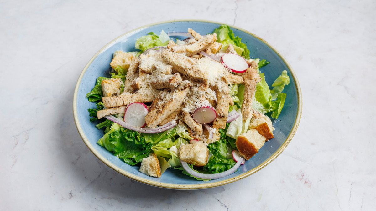 מיקס חסה, קרוטונים, רוטב קיסר, בצל סגול ופרמז׳ן