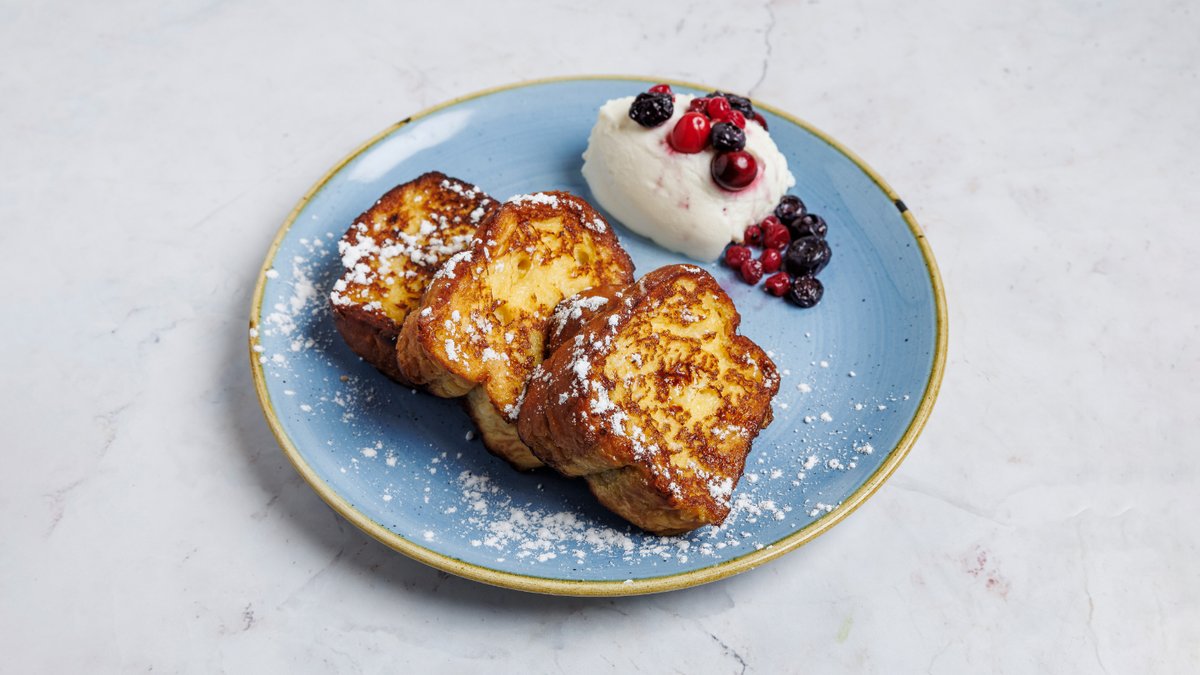 מלחם בריוש צרפתי, מוגש עם קציפת מסקרפונה וקולי פירות יער