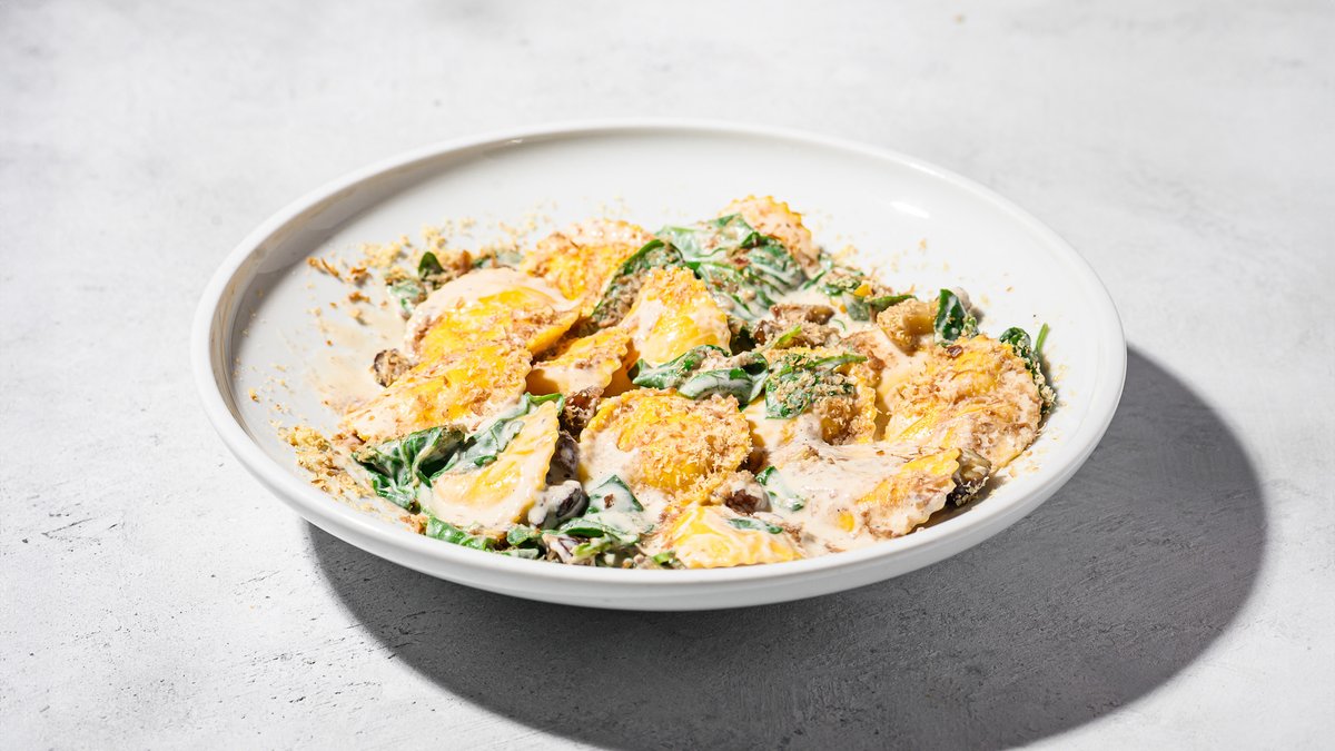 כיסוני בצק פסטה עשיר בחלמונים ממולאים בקרם בטטה, מוגשים ברוטב שמנת, יין לבן וערמונים עם תרד, נגיעה של צ'ילי יבש וגרמולטה של בריוש ושקדים עם טימין
