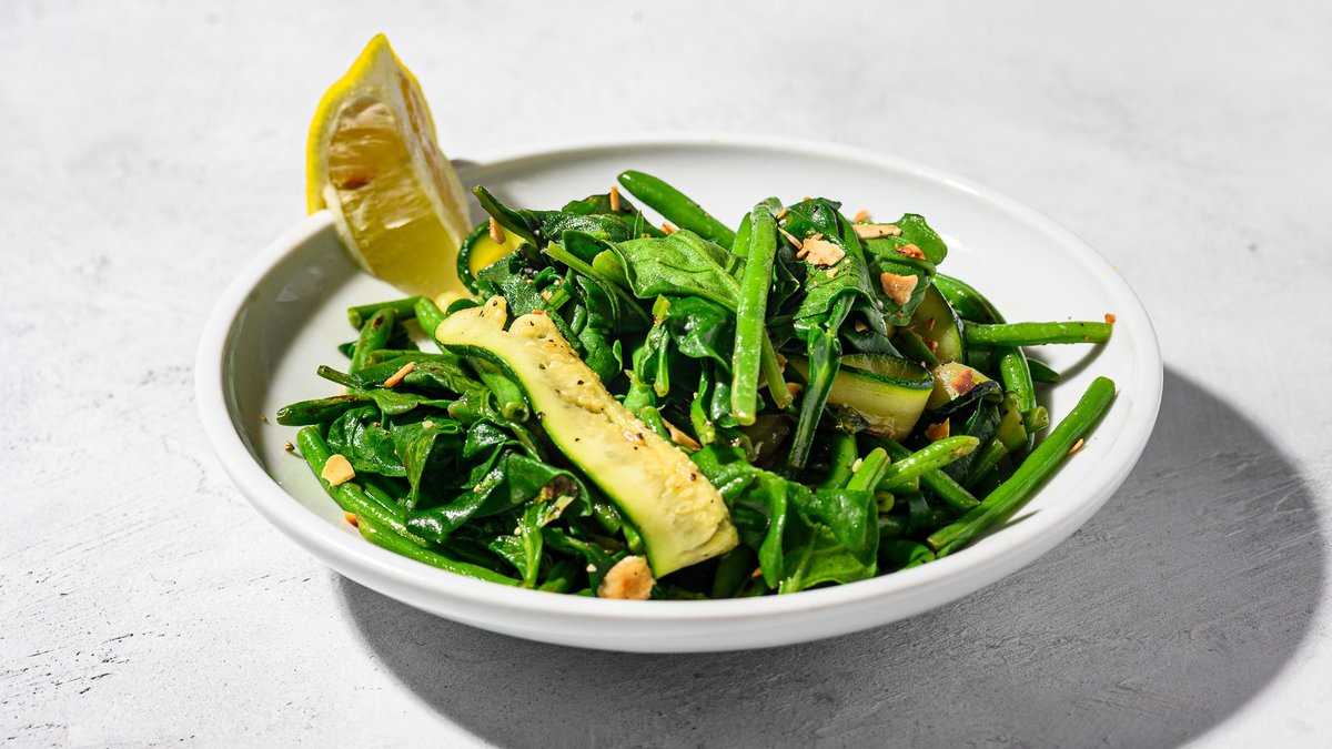 תבשיל עשיר של כוסמת מוקפצת עם טופו, פטריות , גזר, בצל צלוי, זוקיני, תרד, שעועית עדינה, טחינה גולמית, סילאן, פטרוזיליה קצוצה ואגוזי מלך