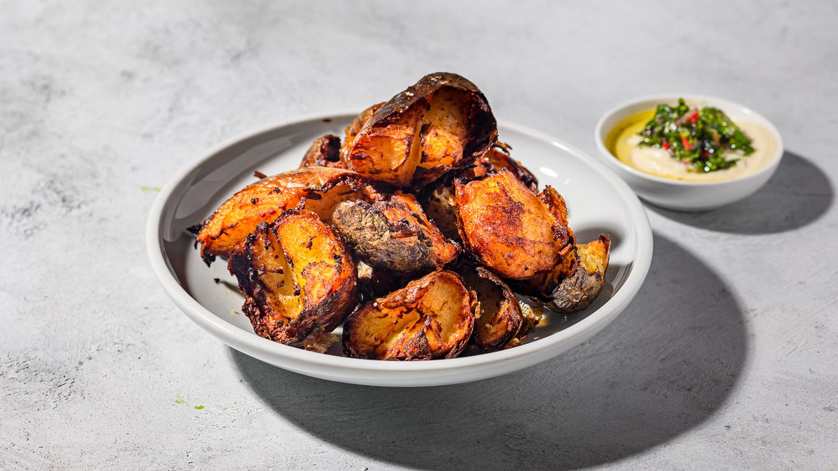 קציצת ביונד (113 גרם) עם בצל צלוי, חסה, עגבנייה, מלפפון חמוץ, חרדל ואיולי בצל בסומק מוגשת עם קרעי תפוחי אדמה צלויים ואיולי טבעוני עם סלסה ורדה