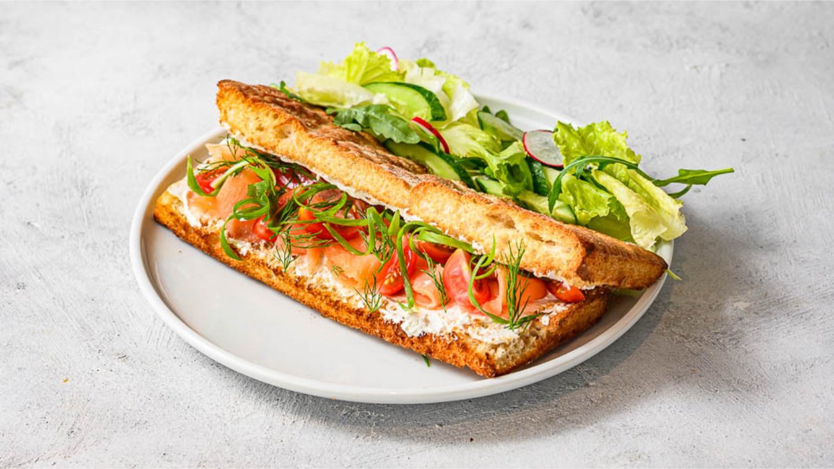 שלוש פרוסות קלויות של לחם בריוש עם סלמון מעושן וגבינה צהובה, איולי חרדל ודבש, פרוסות עגבנייה, רוקט וטבסקו. מוגש עם סלט ירוק