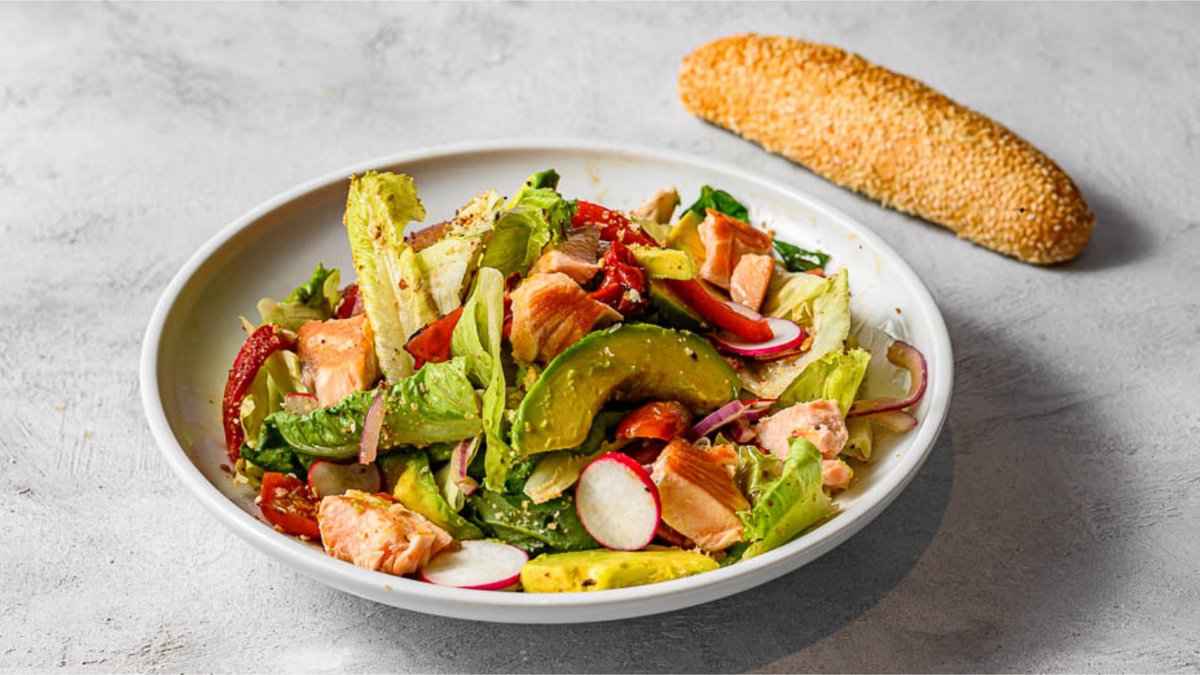 פילה סלמון צלוי עם סלט ירקות עשיר – עגבניות שרי, זיתי קלמטה, פלפלים קלויים, ארוגולה, בצל סגול וצנוניות. מוגש עם תוספת אלרגנים: סויה