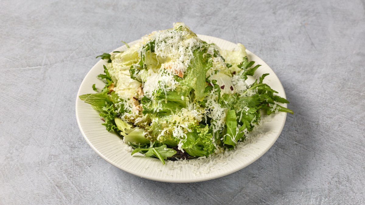 חסות משתנות, פרי עונתי, חומץ בלסמי לבן, ויניגרט אגוזים ודבש, קשיו קלוי ופיקורינו.