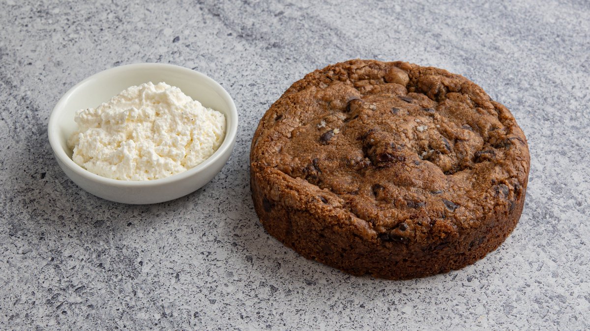 עוגיית שוקולד צ'יפס ענקית עם מלח ים וממולאת בנוטלה. מגיע עם שמנת חמוצה. מכיל גלוטן ואגוזים. מתאים לנשים בהיריון.