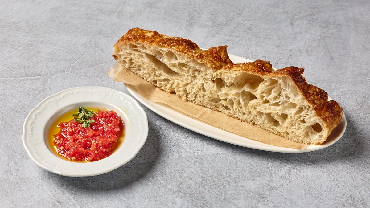 רוטב עגבניות, מוצרלה וטבעות צ'ילי.