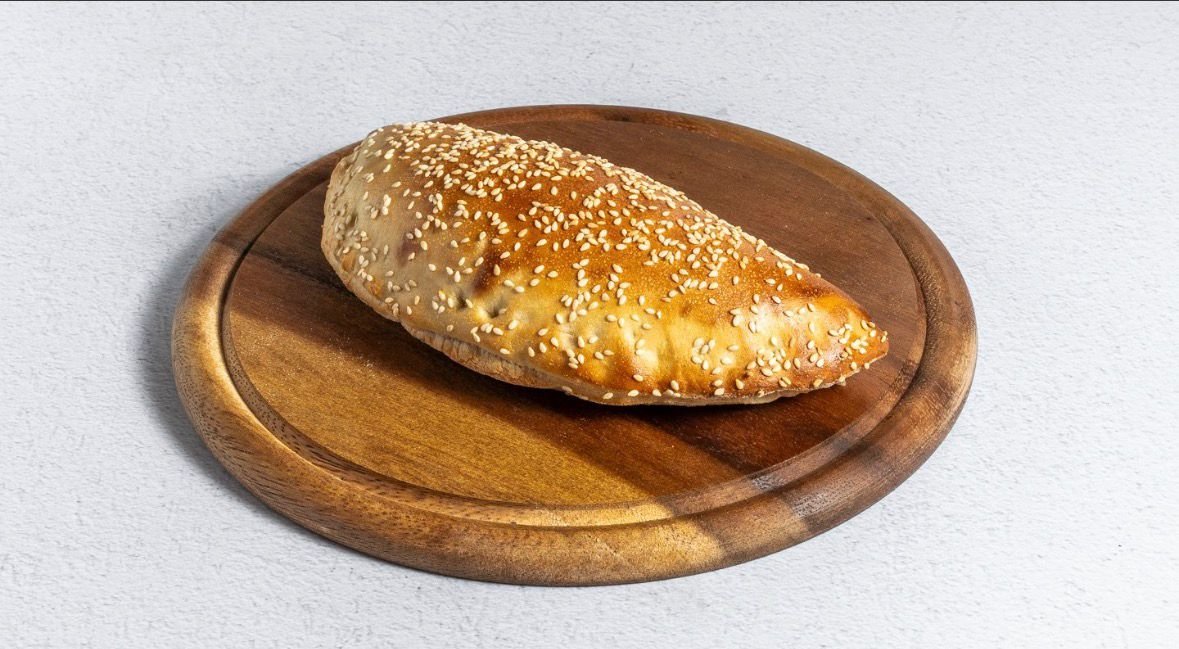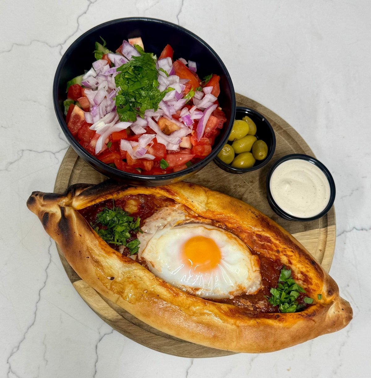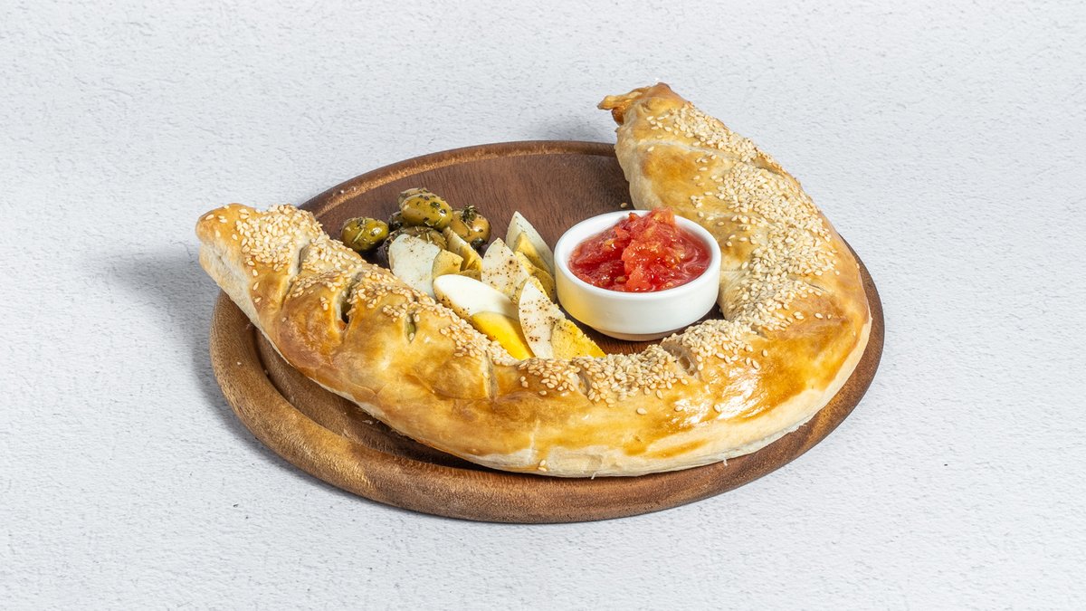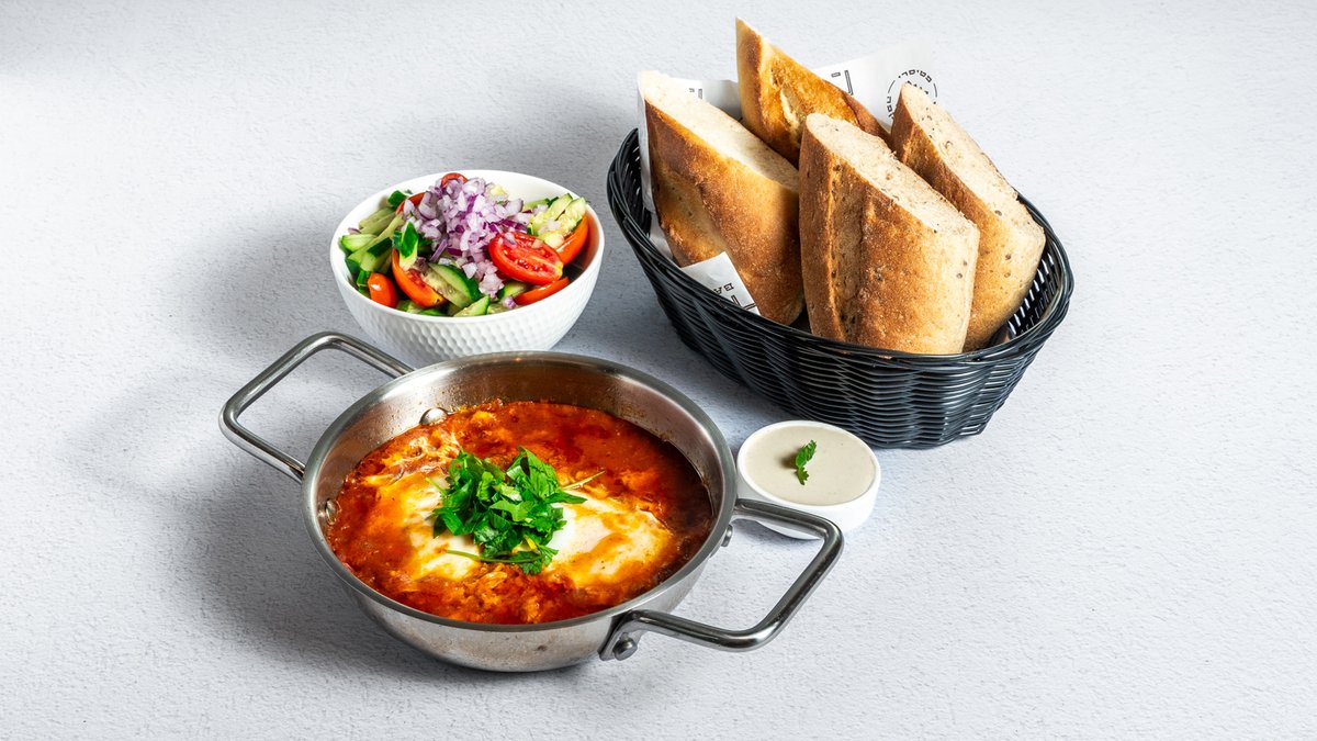 מאפה מבצק פוקאצ׳ה במילוי רוטב שקשוקה וביצה , מוגש בליווי סלט אישי טחינה וזיתים
