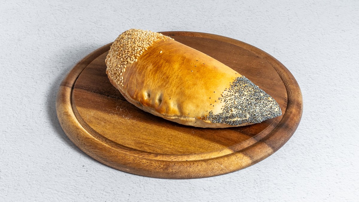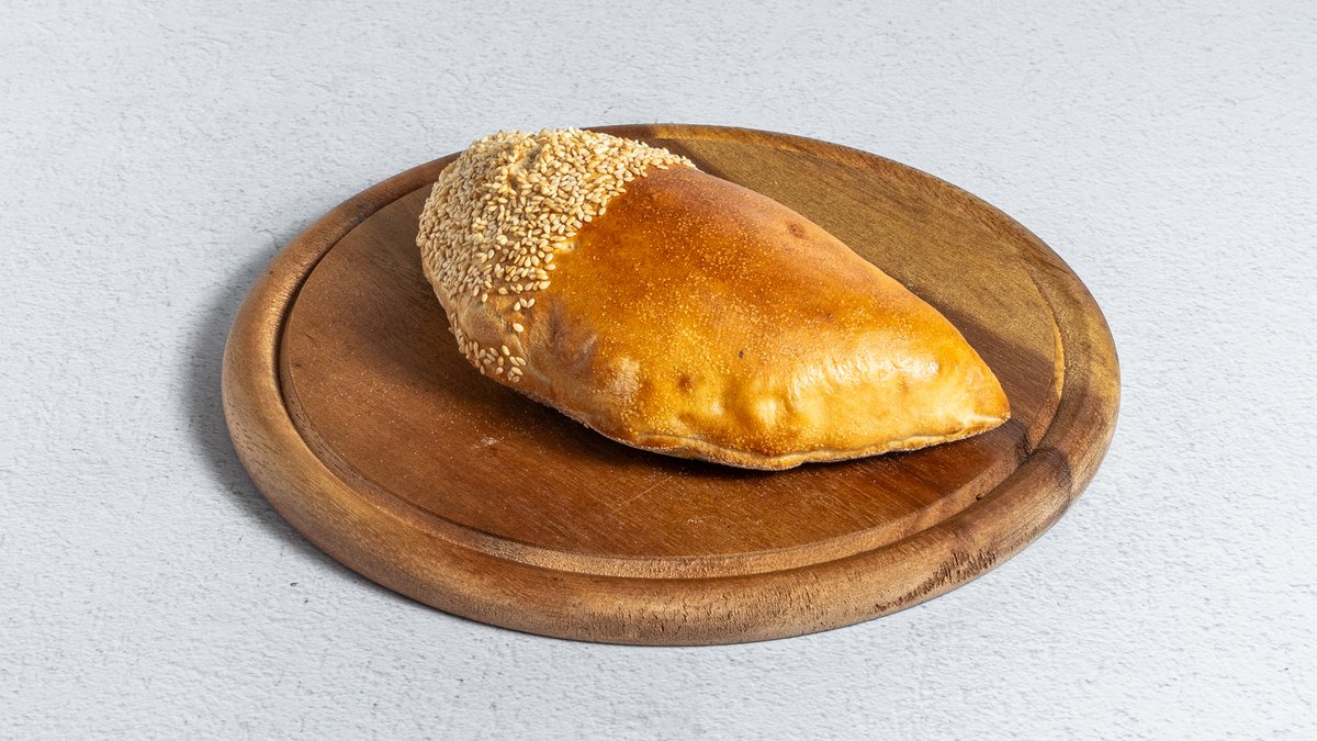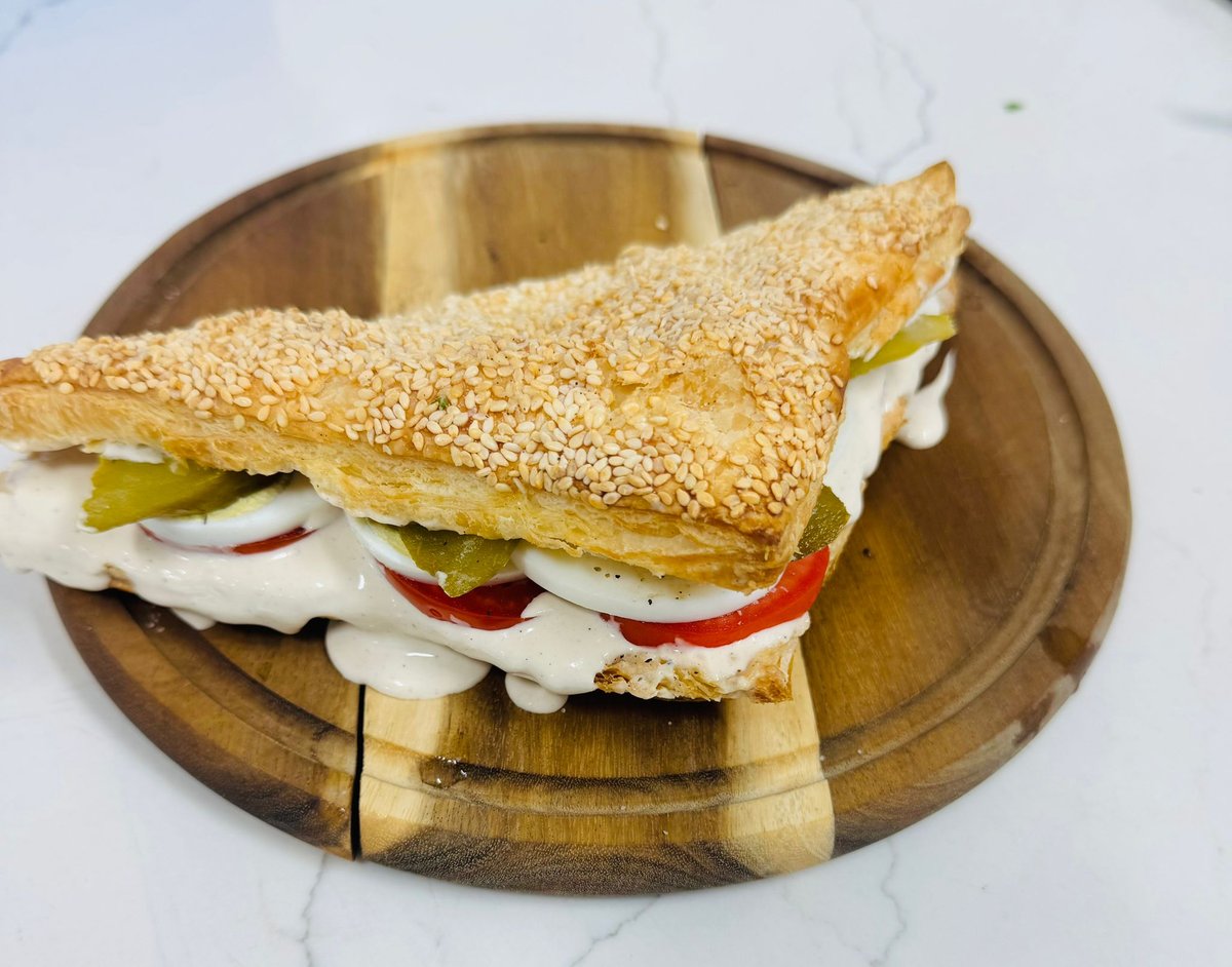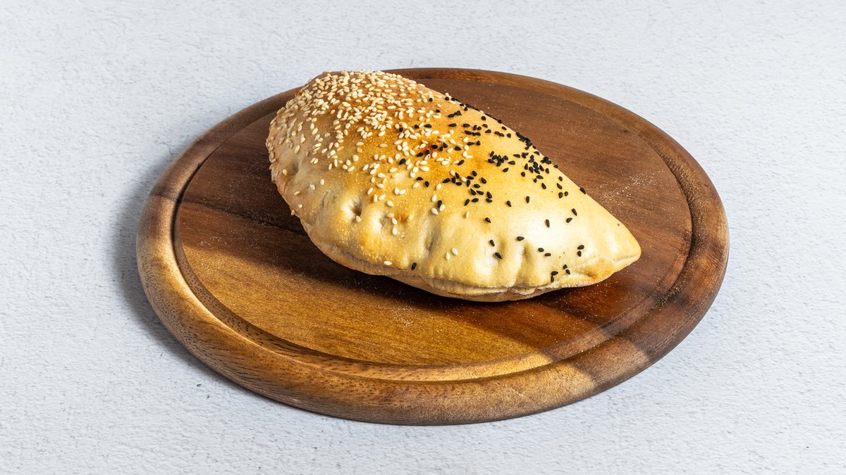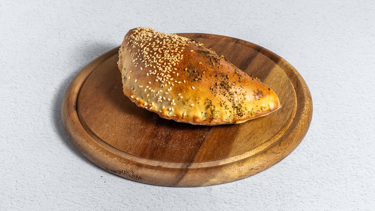 מאפה מבצק פוקאצ׳ה במילוי רוטב שקשוקה וביצה , מוגש בליווי סלט אישי טחינה וזיתים
