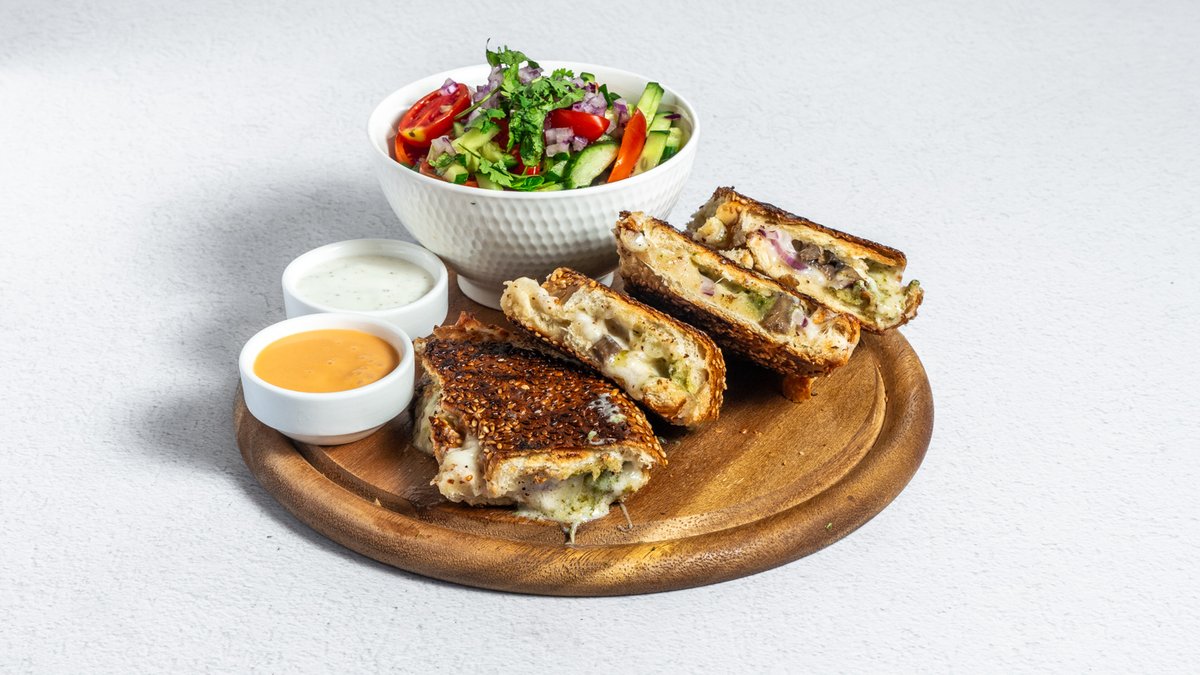 מאפה מבצק פוקאצ׳ה במילוי גבינות וביצים מוגש בליווי סלט קצוץ רוטב איולי וזיתים