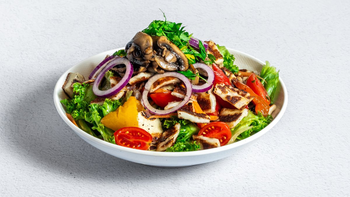 קוביות חלומי, פטריות מקפצות, גזר, מלפפון, פלפל קלוי, בצל סגול, עגבניות שרי, פטרוזיליה, בטטה, כרוב לבן צלוי, חסה ושמן זית לימון