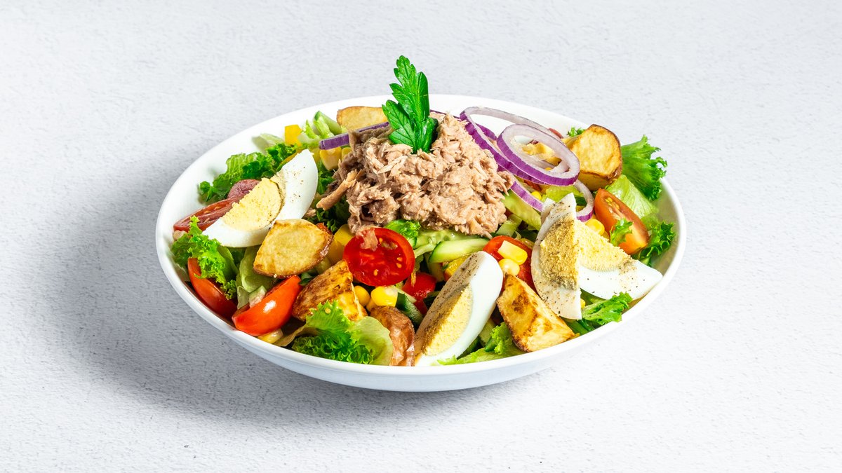 חסה, תפוחי אדמה, טונה, תירס, ביצה קשה, מלפפון ירוק, פלפלים, עגבניות, מלפפון חמוץ, בצל סגול, פטרוזיליה ושמן זית לימון