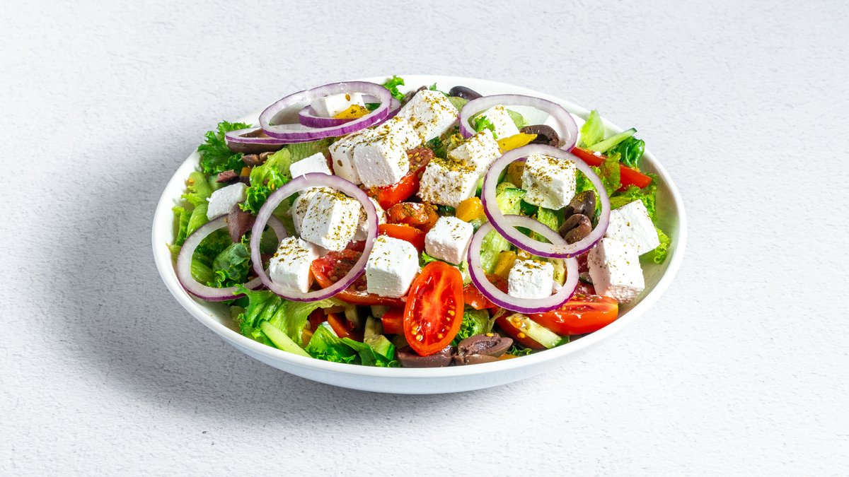חסה, עגבניות, מלפפונים, פלפלים, בצל סגול, זיתי קלמטה, זעתר וסומק, קוביות גבינה בולגרית ושמן זית לימון