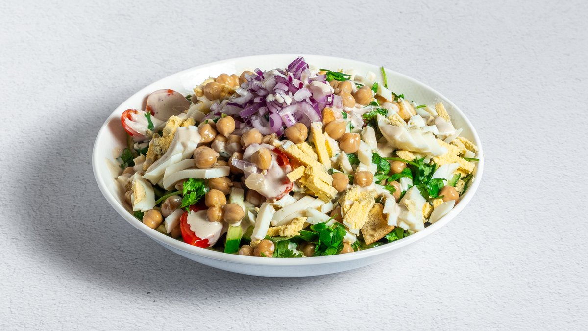 עגבניות, מלפפונים, קרוטונים, טחינה, ביצה קשה מגורדת, גרגירי חומוס חם, בצל סגול, פטרוזיליה ושמן זית לימון