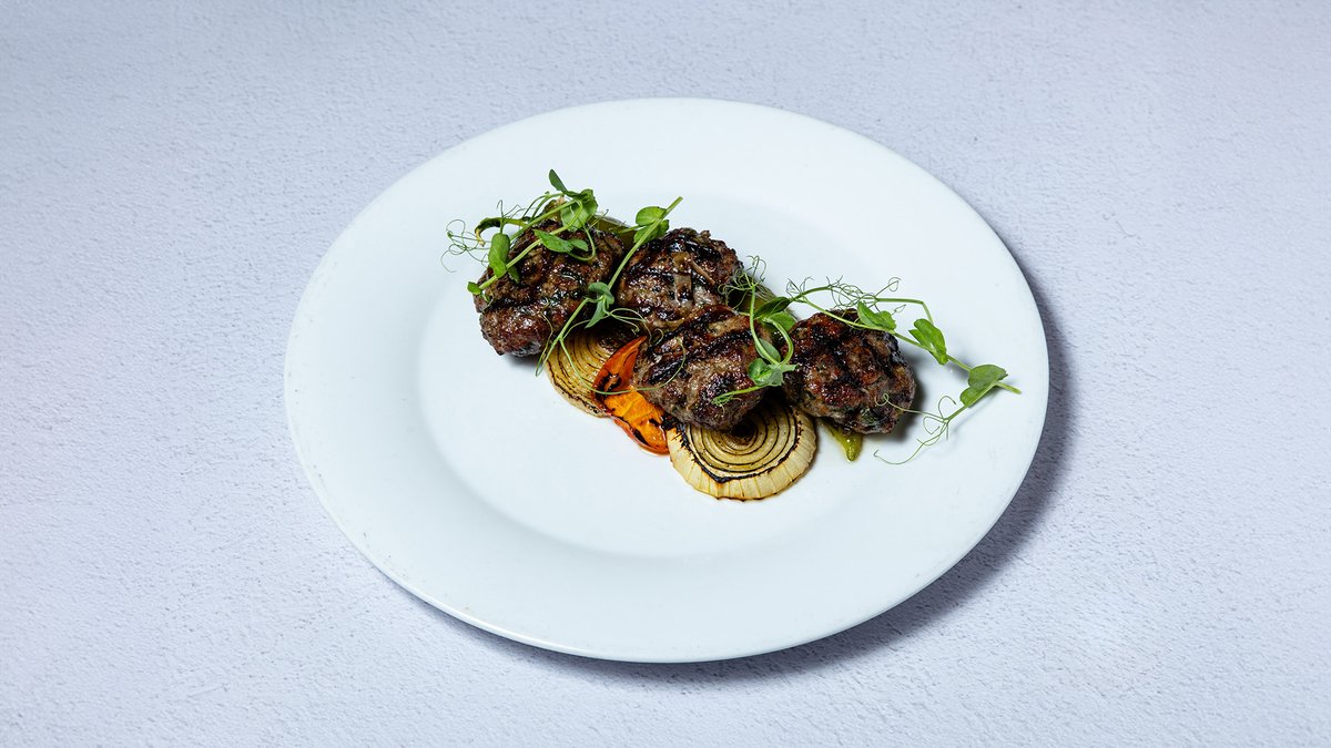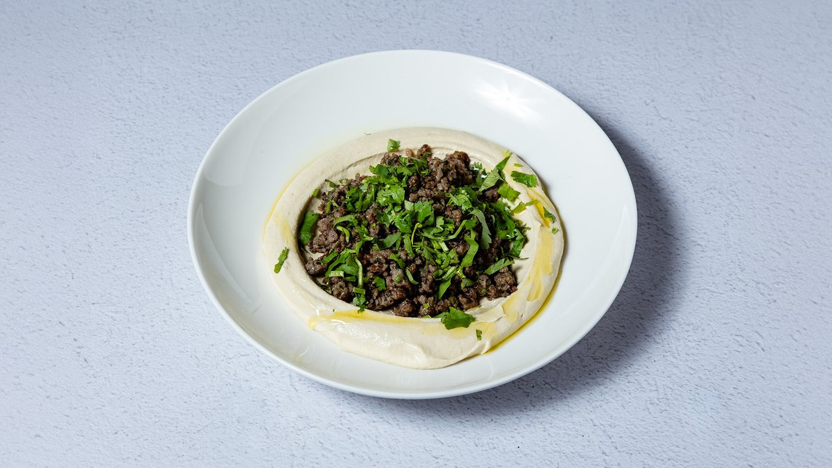 בשר עגל קצוץ דק דק, בצל עשבים ירוקים וטחינה הר ברכה