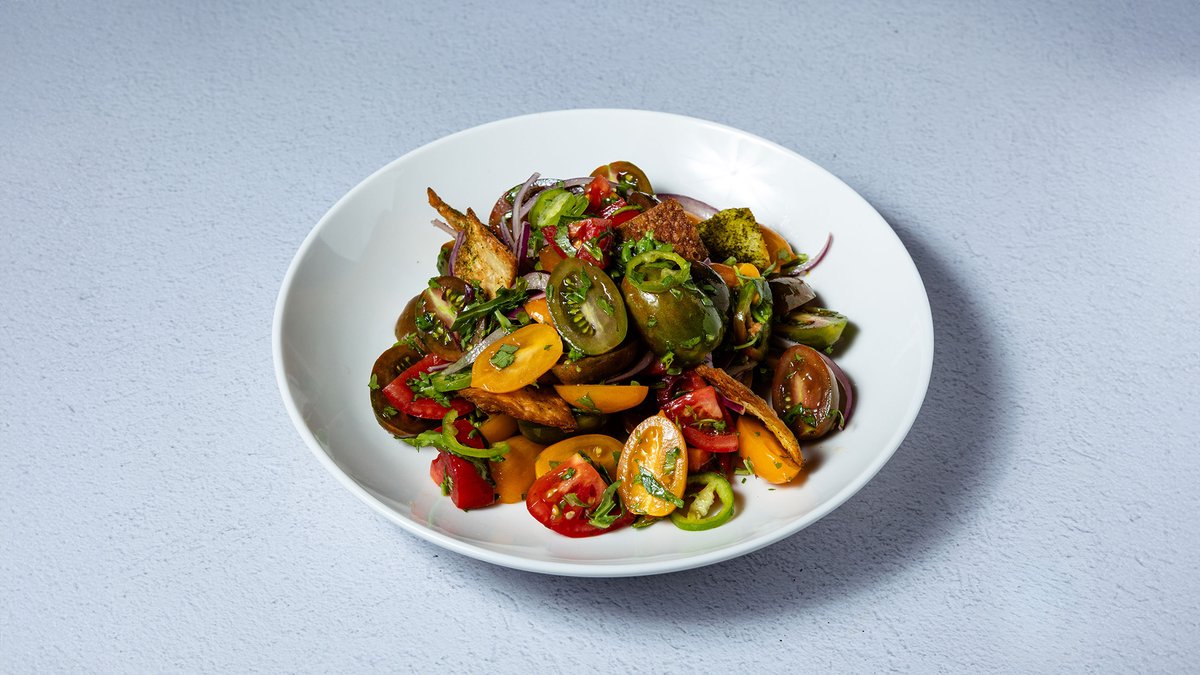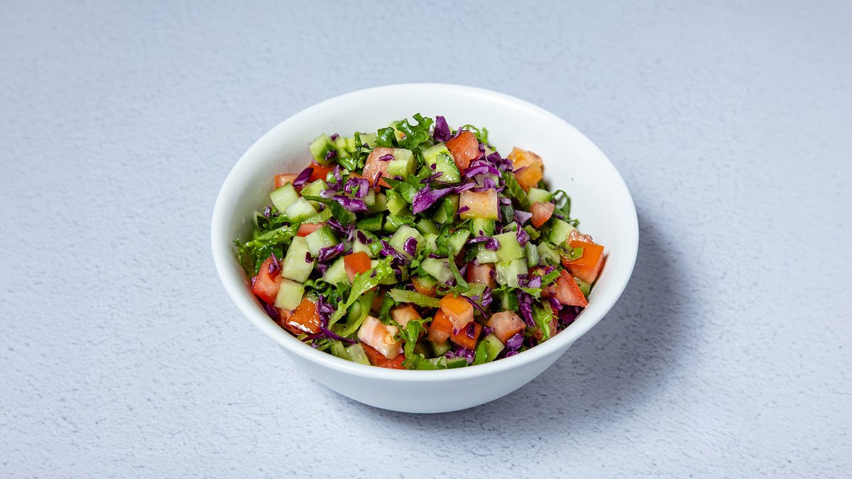 רוקט, בצל סגול, צ'ילי ירוק, ויניגרט רימונים ושמן זית