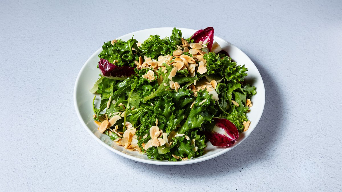 חסה לליק, תפוח נאשי ביין, שקדים קלויים, גבינת עיזים טבעונית וויניגרט תפוז