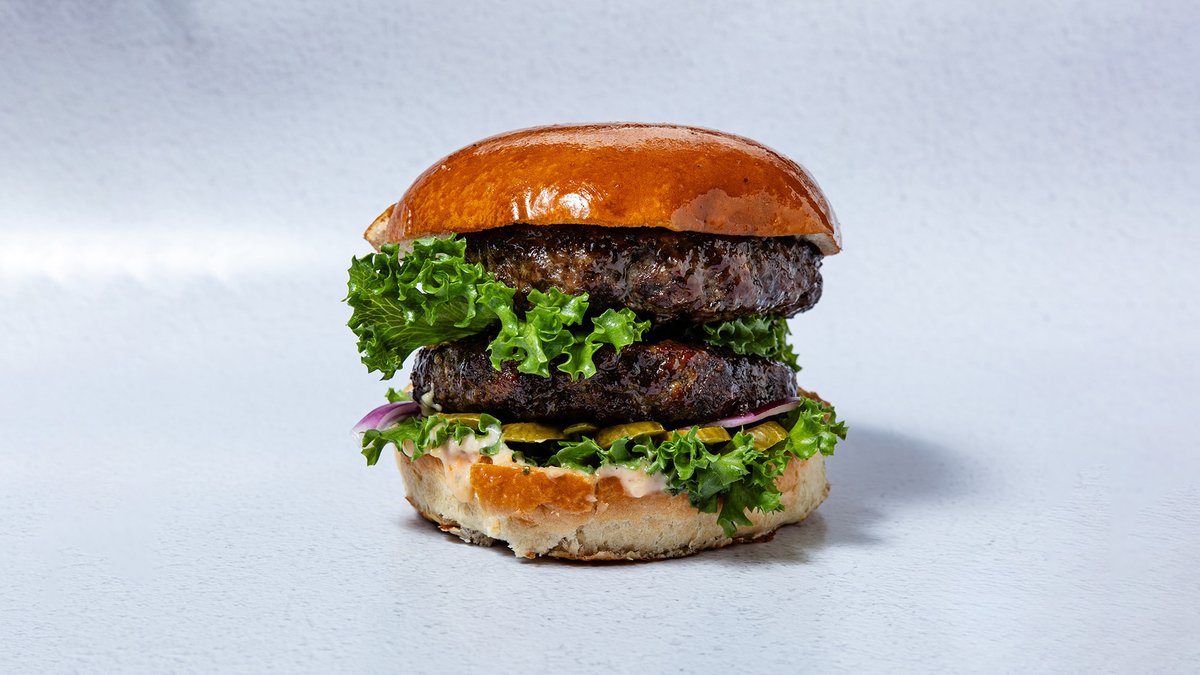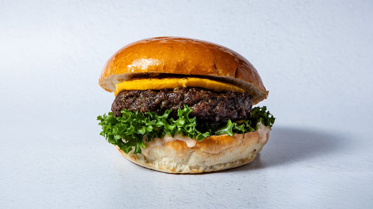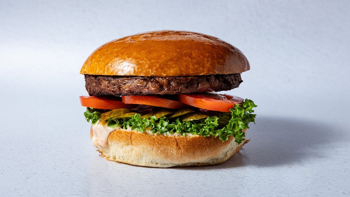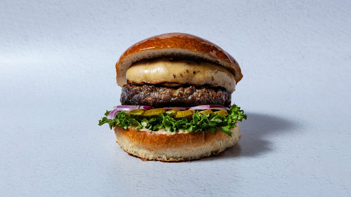 מנתח אנטריקוט טרי הנטחן במקום, צ'דר טבעונית | מוגש בלחמניית בריוש, איולי הבית, חסה, בצל וחמוצים