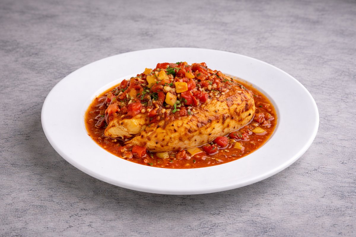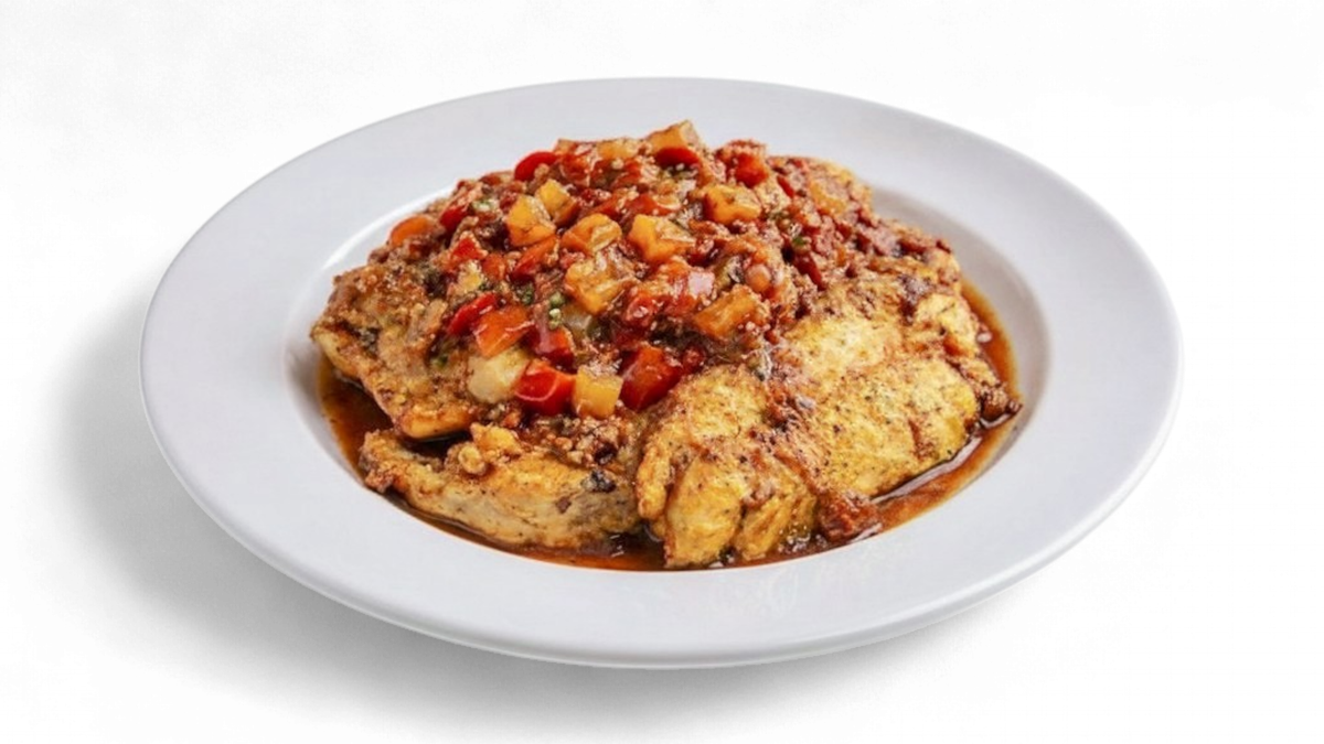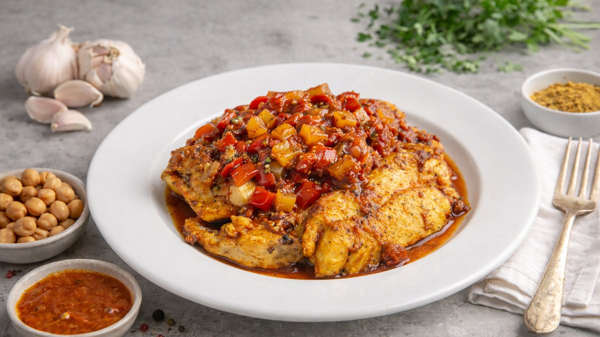 חזה עוף עבה ועסיסי ברוטב פלפלים, שום, בצל, רוטב אדום ופיקנטי - מושלם לצד אורז לבן