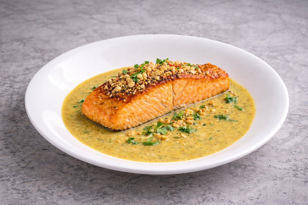 פילה סלמון ברוטב עשיר של קארי ירוק - עם בוטנים בצד.