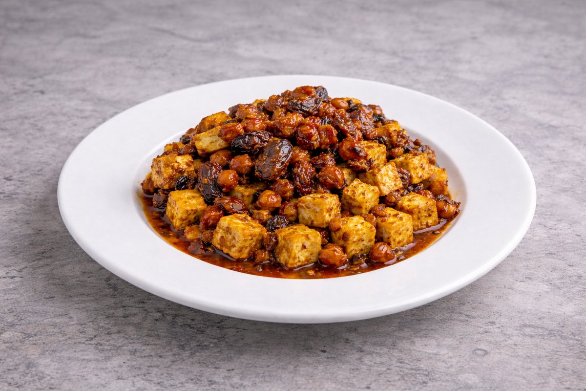קוביות טופו צלויים ברוטב עשיר של פירות יבשים מקורמלים - מנה טבעונית