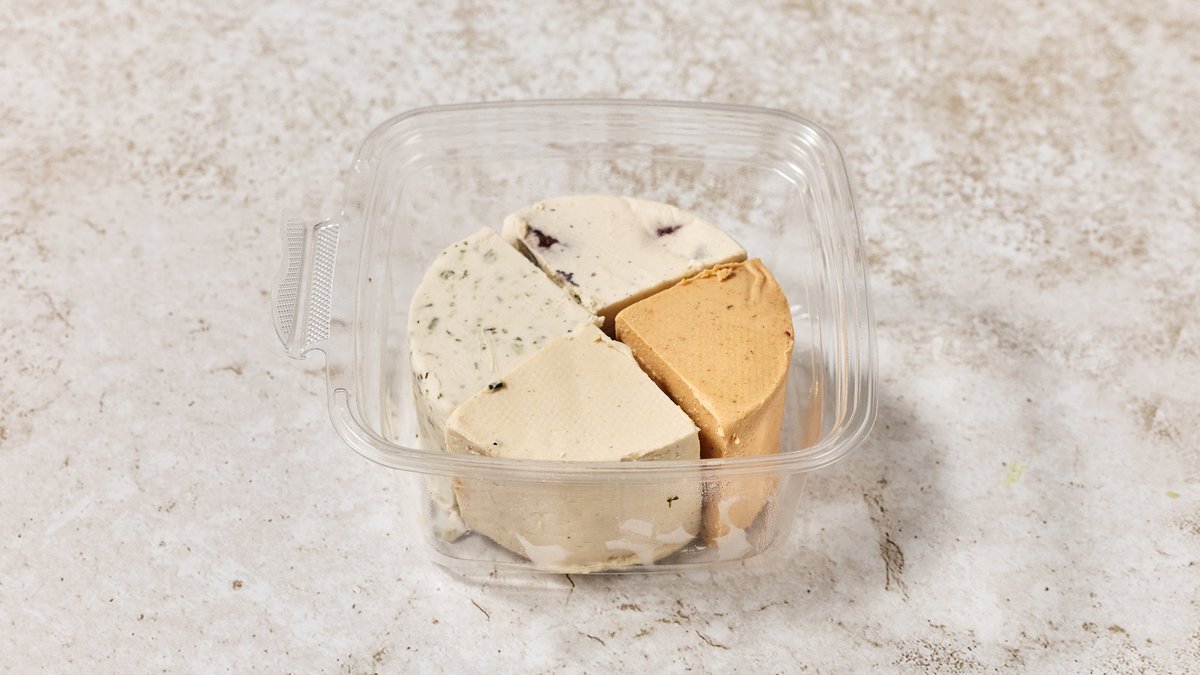 צלחת גבינות משגעת: כיכר גבינת קשיו 4 טעמים, גבינת שקדים זיתי קלמטה 250 מ"ל, גבינת שקדים שום ושמיר 250 מ"ל, פטה שקדים אפויה 250 מ"ל, פטה עדשים שחורות 250 מ"ל, פסטו עשבי תיבול 180 מ"ל בליווי קרקר חומוס או לחם טף ללא גלוטן מתאים עם יין לכ - 4-6 אורחים