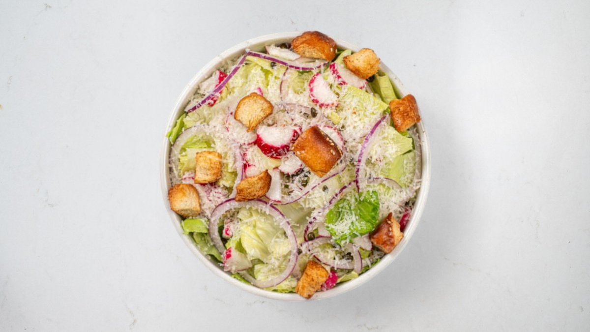 מיקס חסות, צנוניות בצל, צלפים, קרוטונים ופרמז׳ן ברוטב קיסר
