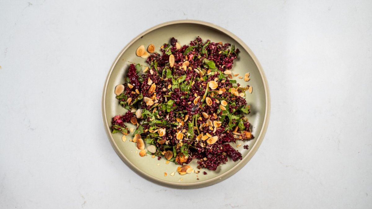 קינואה אדומה, סלקים צלויים, בצל סגול, מיקס ירוקים, פירות יבשים ושקדים