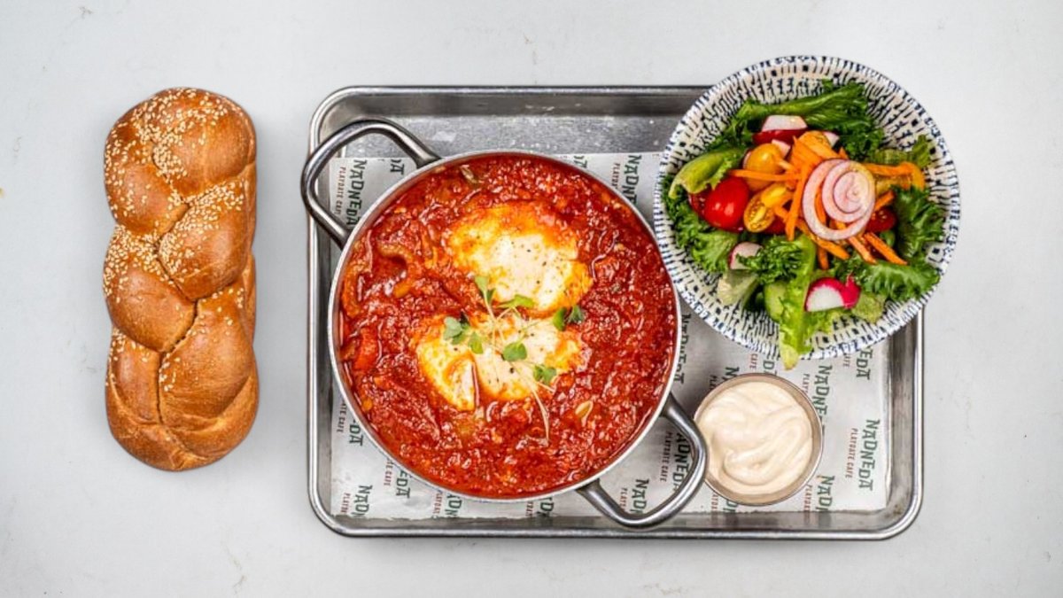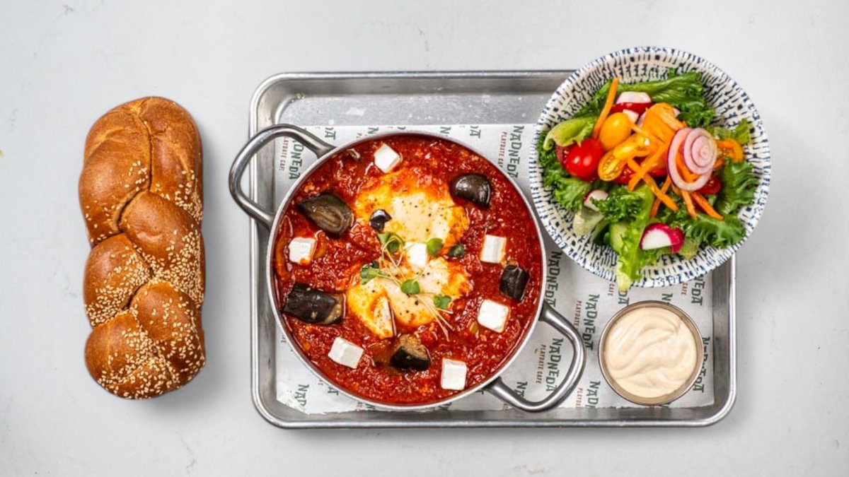 שתי ביצים בתבשיל עגבניות ופלפלים פיקנטי, בתוספת של חצילים קלויים וגבינת פטה מוגשות עם סלט ירוק אישי, חלה אישית וטחינה, מוגש עם קרה לבחירה