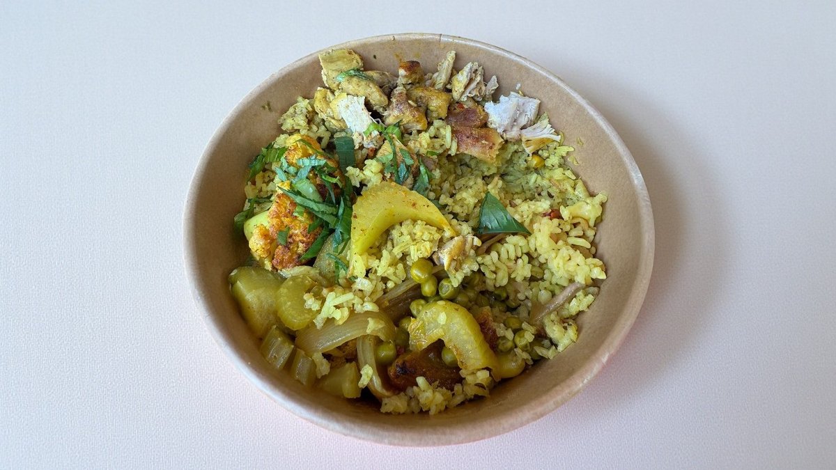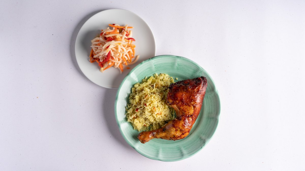 פרגית צלויה מבושלת עם ציר עוף, כרובית, אפונה, סלרי, בצל סגול, זוקיני ושום מוגש על אורז פרסי ריחני וכוסברה טרייה