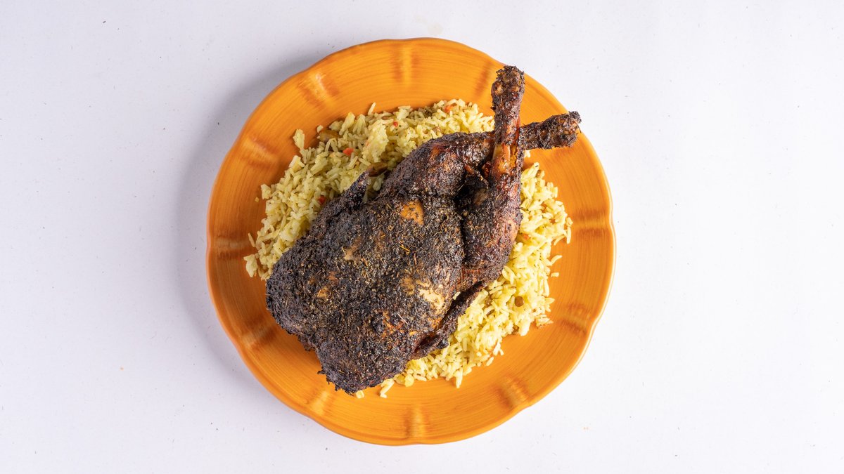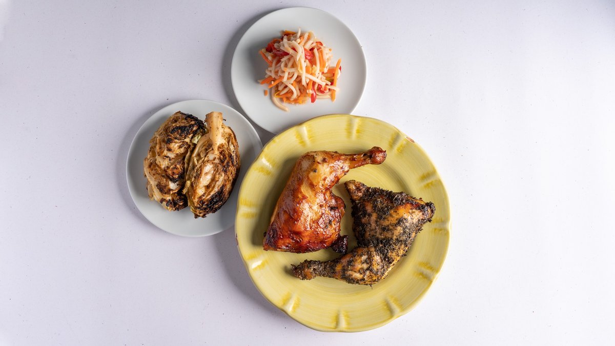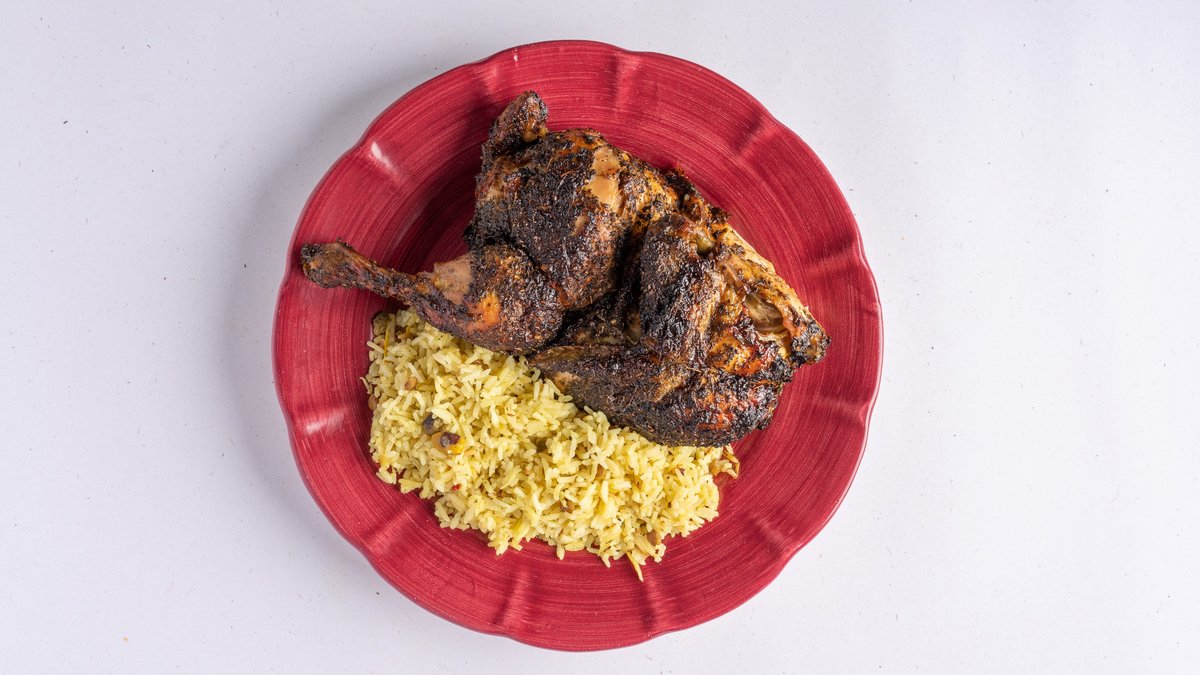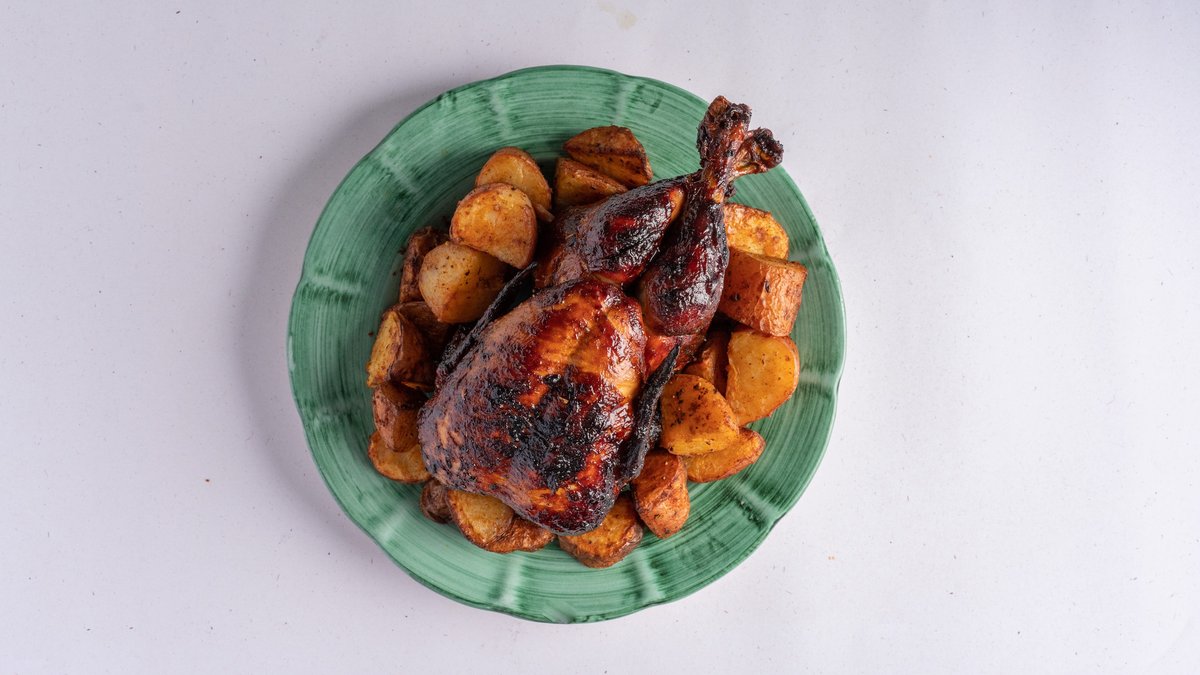 עוף שלם בשמן זית, טימין, רוזמרין, מרווה, פטרוזיליה, שום, בצל, מלח, פלפל, לימון פרסי טחון ולימון מוגש עם שתי תוספות לבחירה