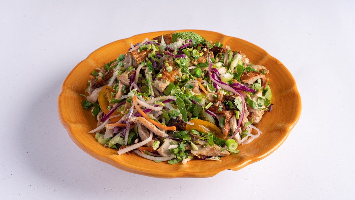 מלפפונים, סלרי, בצל ירוק, כרוב אדום, קולורבי, גזר, כוסברה, אפונת וואסבי, אטריות שעועית ורצועות עוף צלוויות בגלייז אסייאתי(רוטב פיקנטי-חריף). מוגש עם תוספת לבחירה