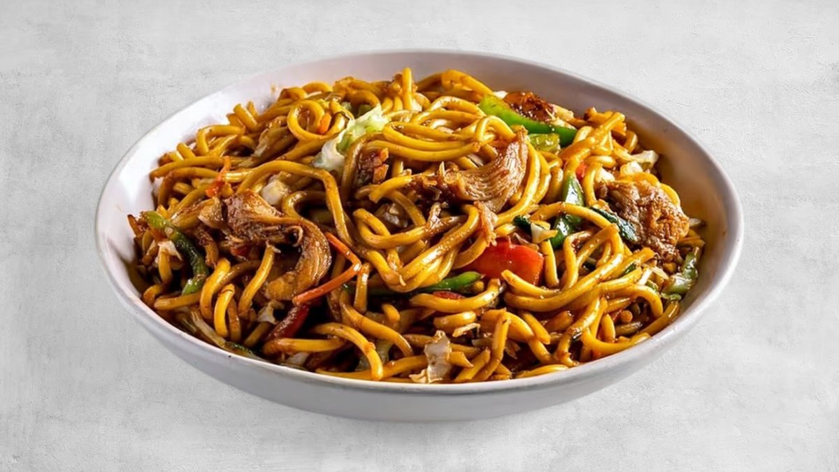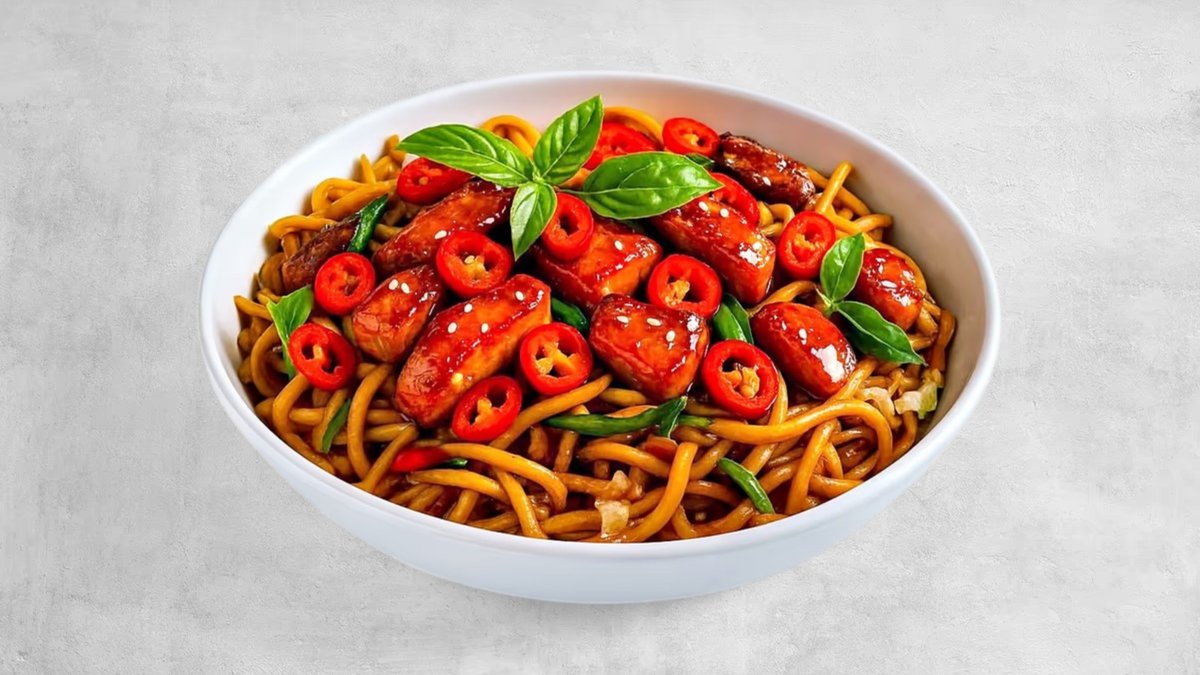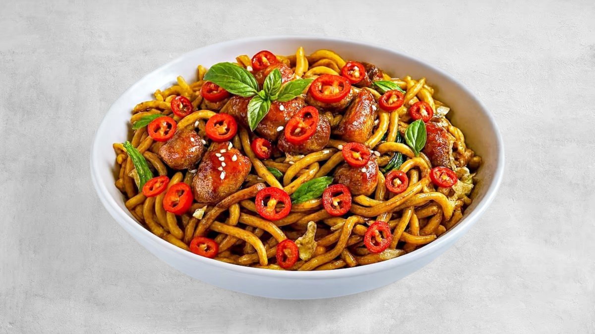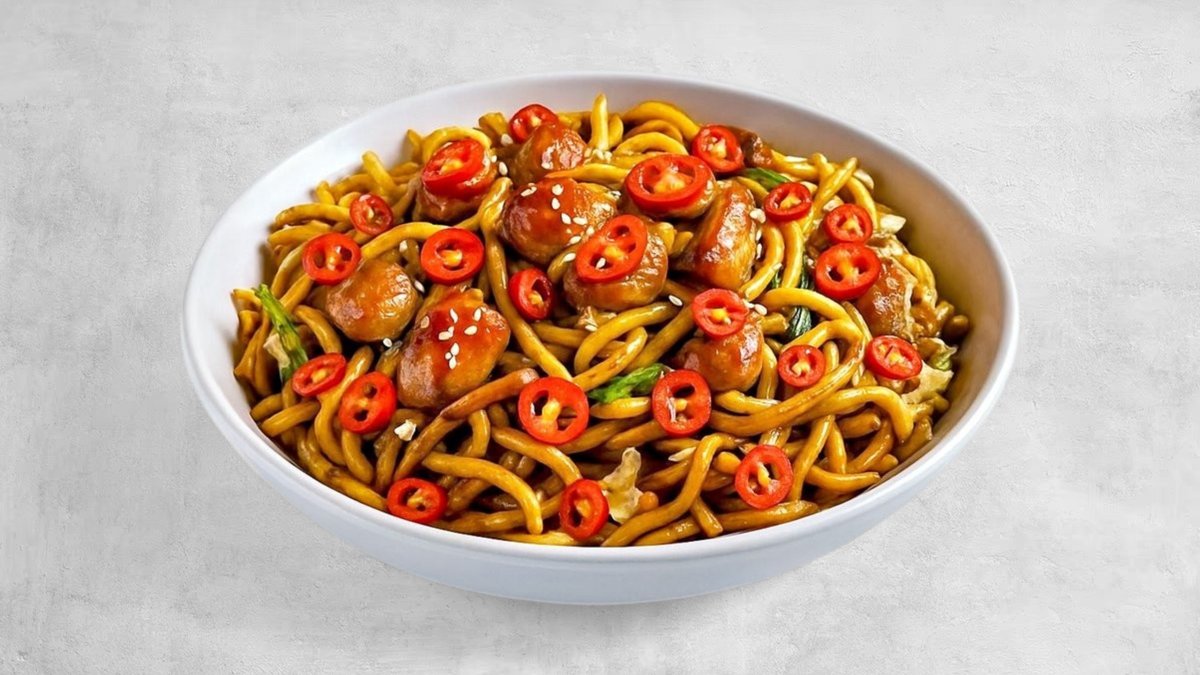 נודלס לבחירה , נתחי עוף במרינדה חריפה , כרוב לבן , גזר צ'ילי אדום ובצל ברוטב סודי על בסיס סויה , הוט סוס וטריאקי עם מיקס צי'לי גרוס מעל