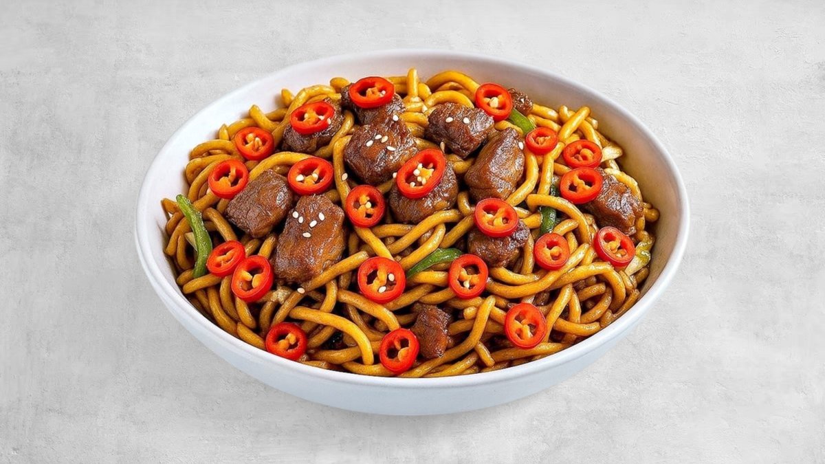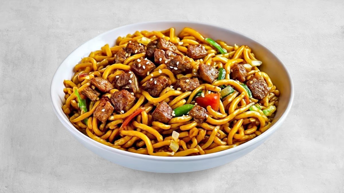 נודלס לבחירה , נתחי סינטה במרינדה חריפה , כרוב לבן , גזר צ'ילי אדום ובצל ברוטב סודי על בסיס סויה , הוט סוס וטריאקי עם מיקס צי'לי גרוס מעל