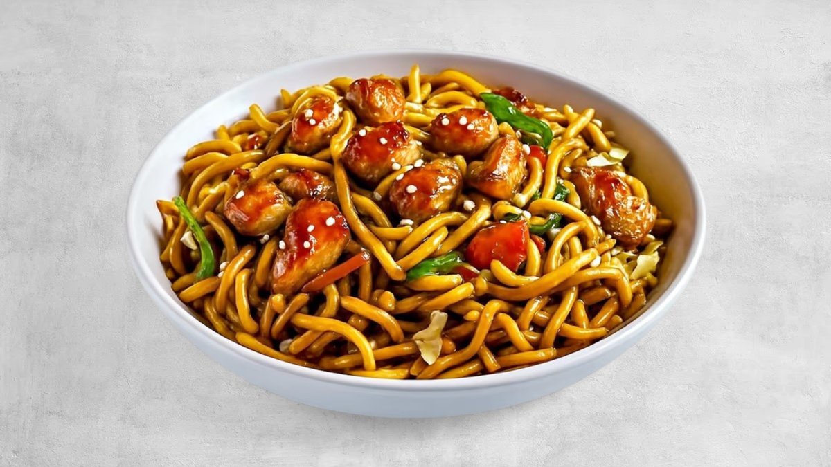 נודלס לבחירה , נתחי עוף במרינדה אסייתית , כרוב לבן , גזר ובצל ברוטב סודי על בסיס טריאקי עם שבבי בצל קריספי מעל