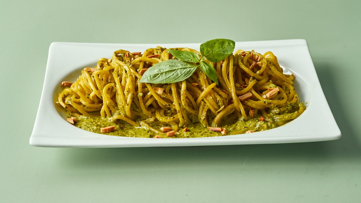 פסטה קרה, עגבניה, מלפפון, גמבה, בזיליקום ואורגנו ברוטב הבית