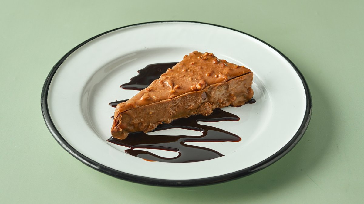 מצע קראנצ'י של שוקולד מריר, נוגט ובייגלה, קרם שוקולד קטיפתי שבמרכזו קרם ברולה בציפוי קריספי מתפצפץ של נוגט ובייגלה