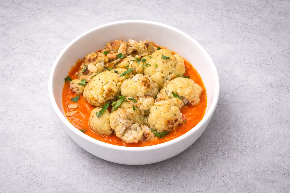 כרובית אפויה בתנור, קרם עגבניות שרי, אורגנו טרי, שמן זית, שקדים וצ׳ילי.