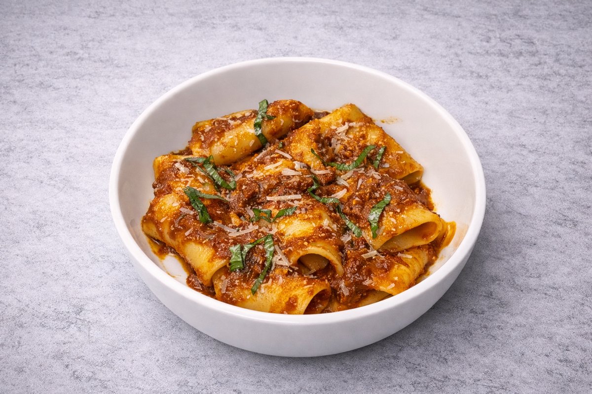 ספגטי פאקרי, אונטריב בבישול ארוך, ציר עגבניות ובשר, חמאה, בזיליקום ופרמזן