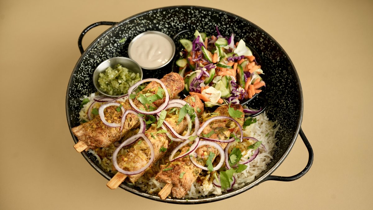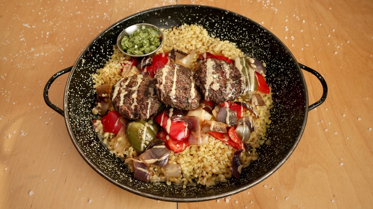שלושה קבבים מנתחי פרימיום על מצע אורז, עם בצל ופלפלים קלויים על האש, רוטב טחינה גולמית וצ'טני חריף בצד