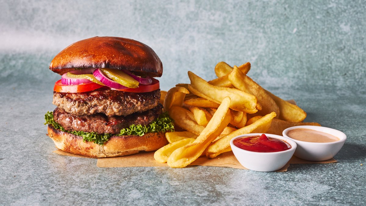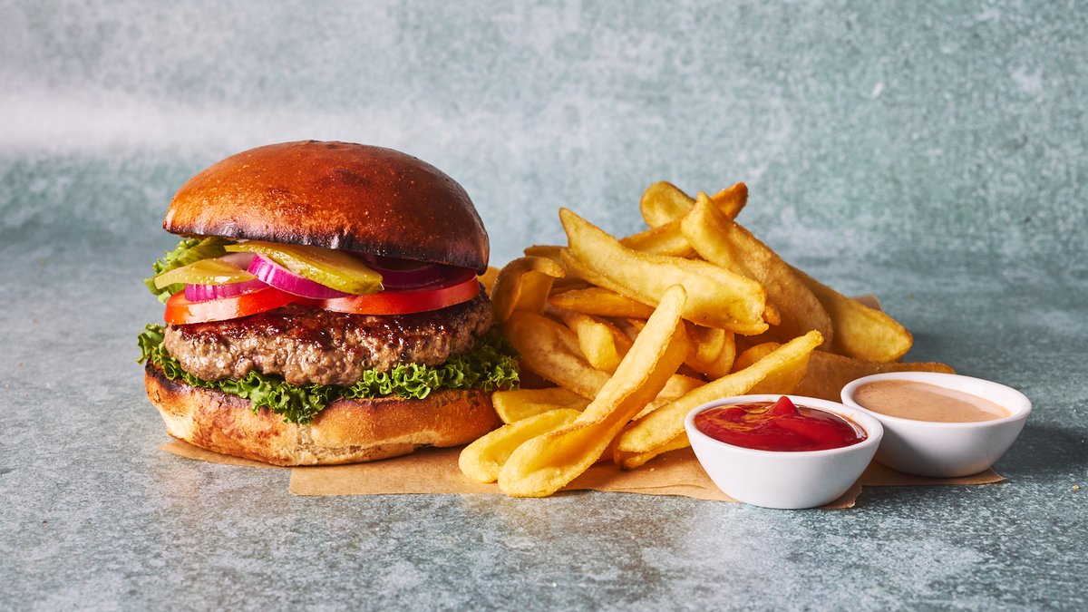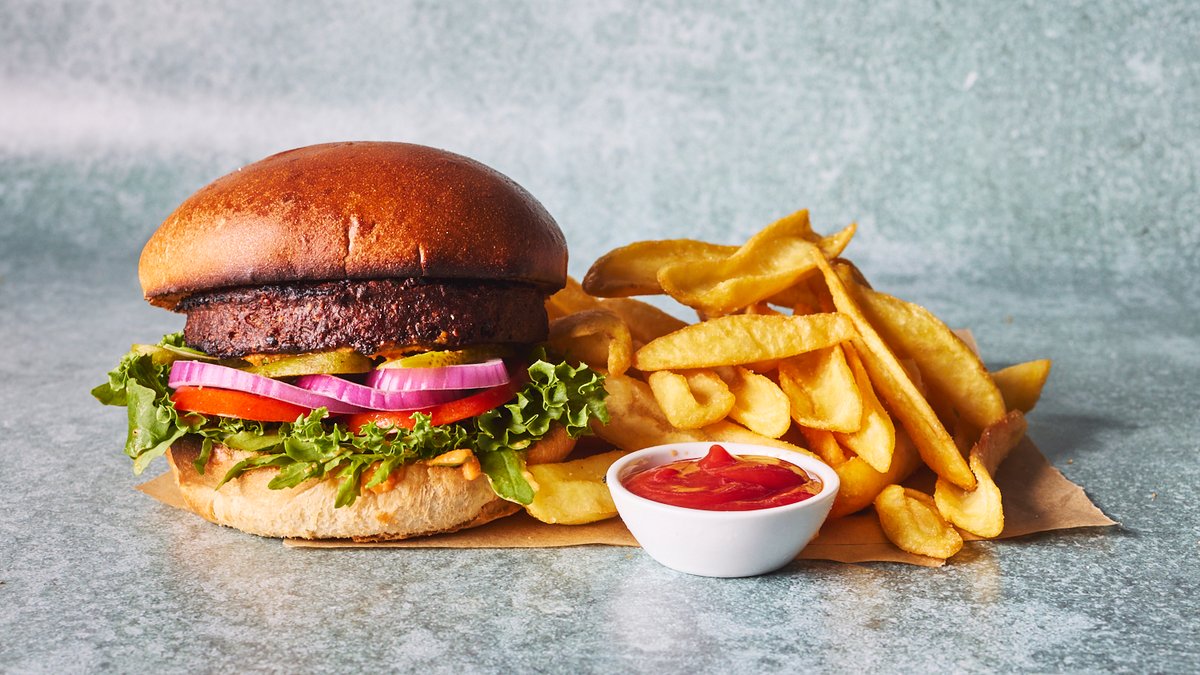 קציצת עדשים, קינואה וסלק בלחמניה עם רוקט ודיפ עגבניות, חסה לאליק, עגבנייה, קורנישון ובצל סגול מוגש עם צ'יפס הולנדי, קטשופ ואיולי צ'יפוטלה