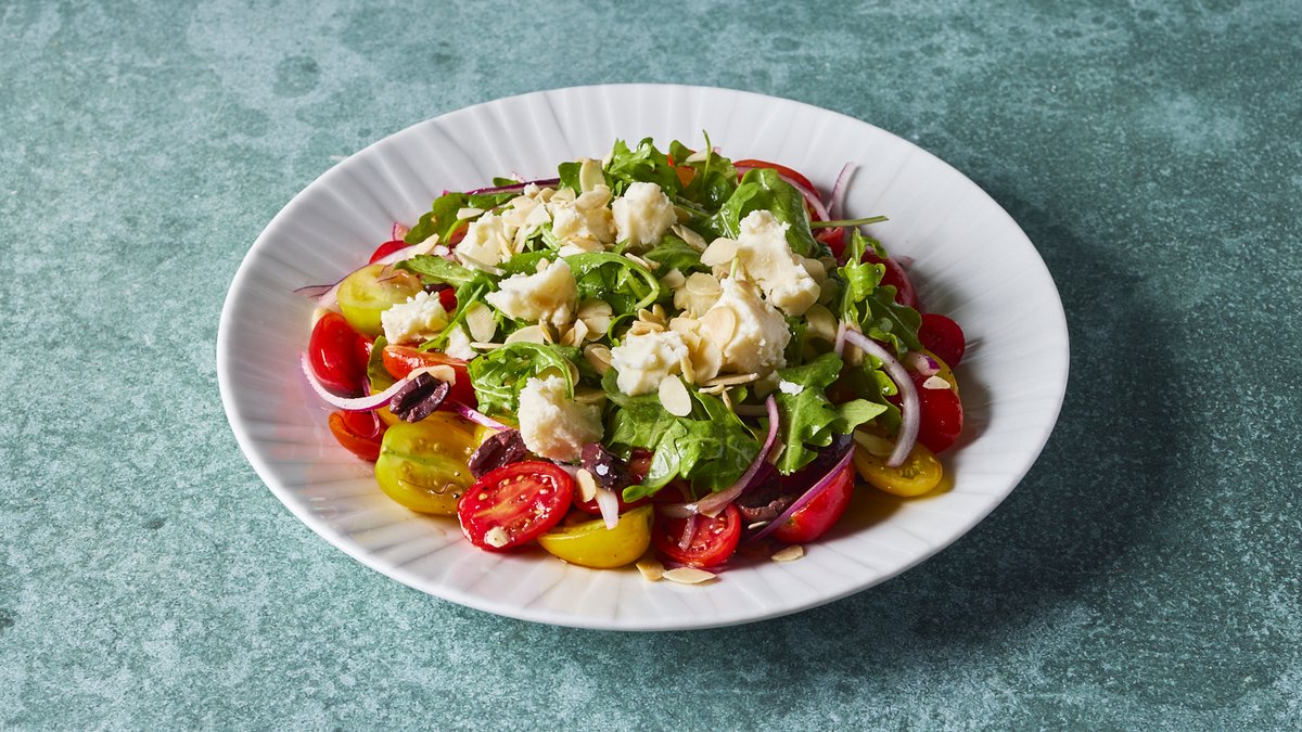 עם בצל סגול, ארוגולה, זיתי קלמטה, שקדים קלויים וגבינת טולום