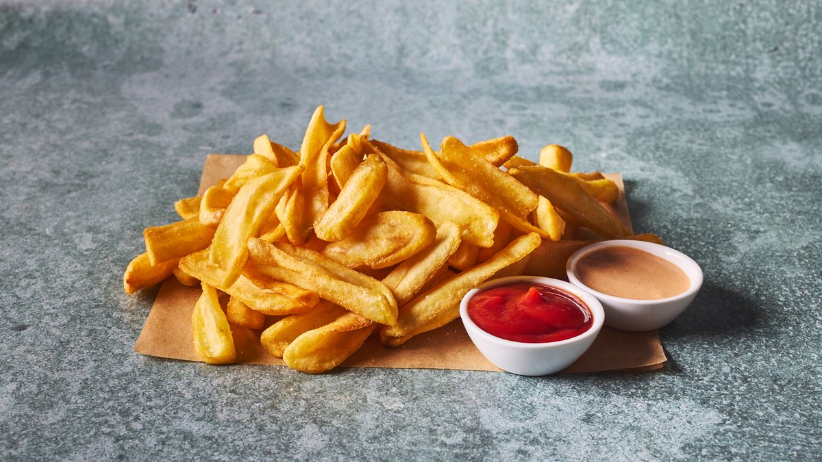 חסה לאליק, עגבנייה, קורנישון ובצל סגול מוגש עם צ'יפס הולנדי, קטשופ ואיולי צ'יפוטלה
