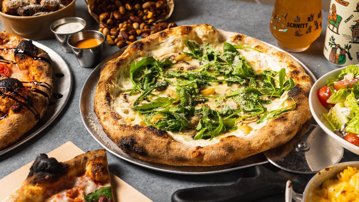 רוטב ביאנקה (רוטב גבינות ללא רוטב עגבניות), מוצרלה פטריות, שום קונפי רוקט ופרמז'ן