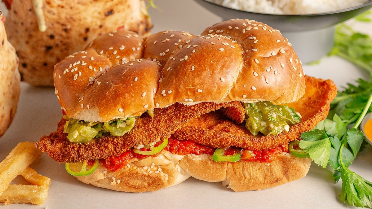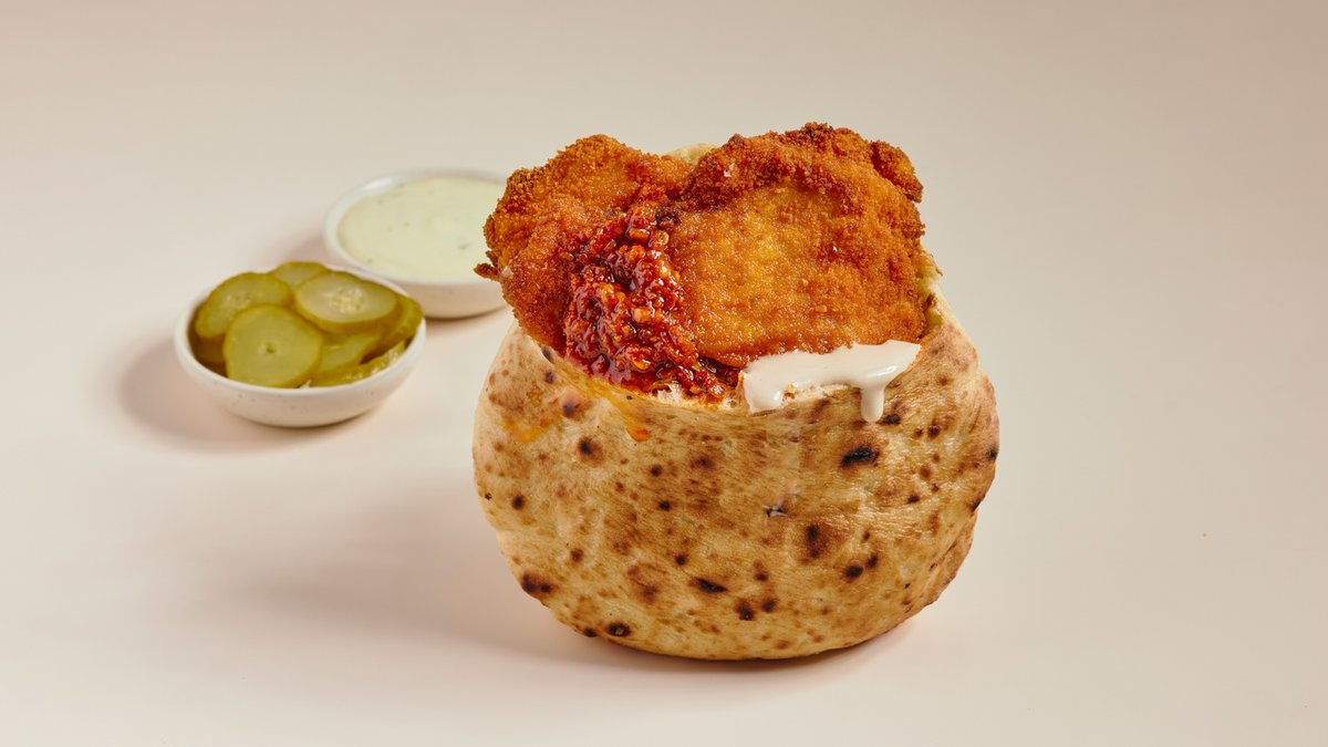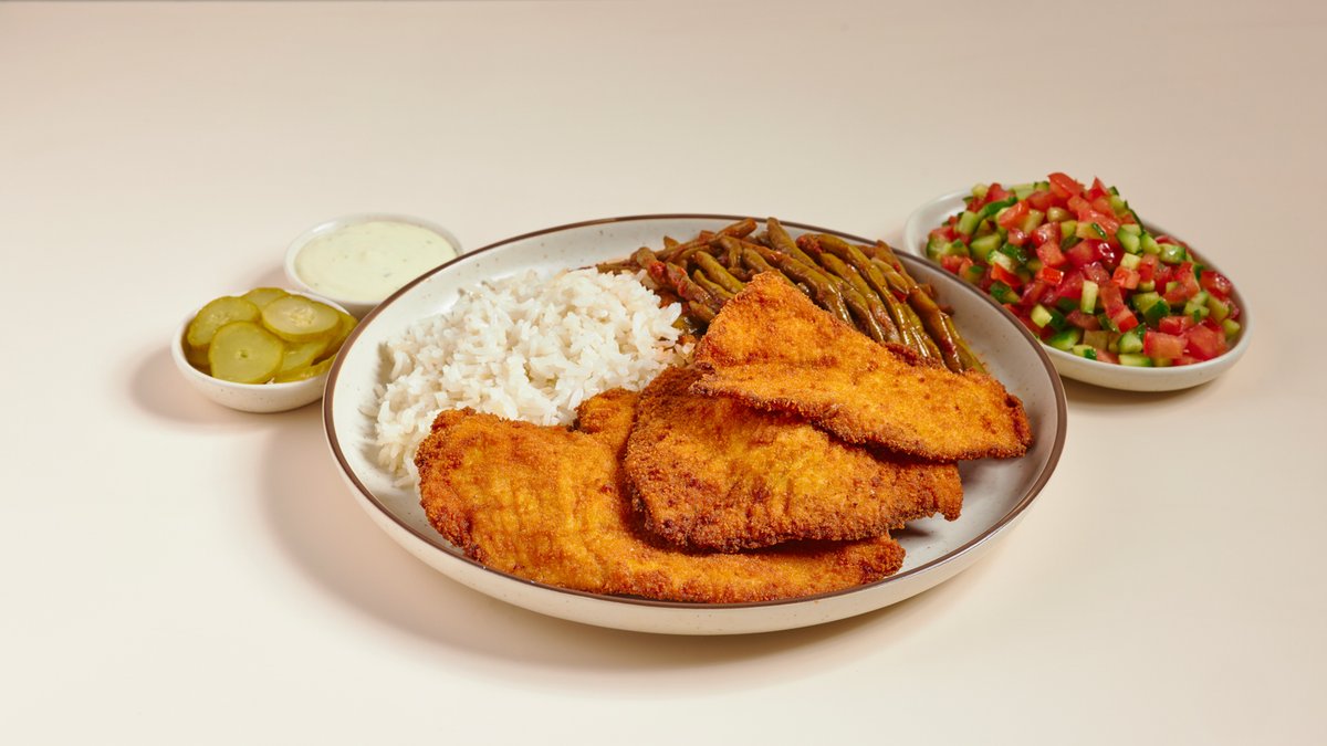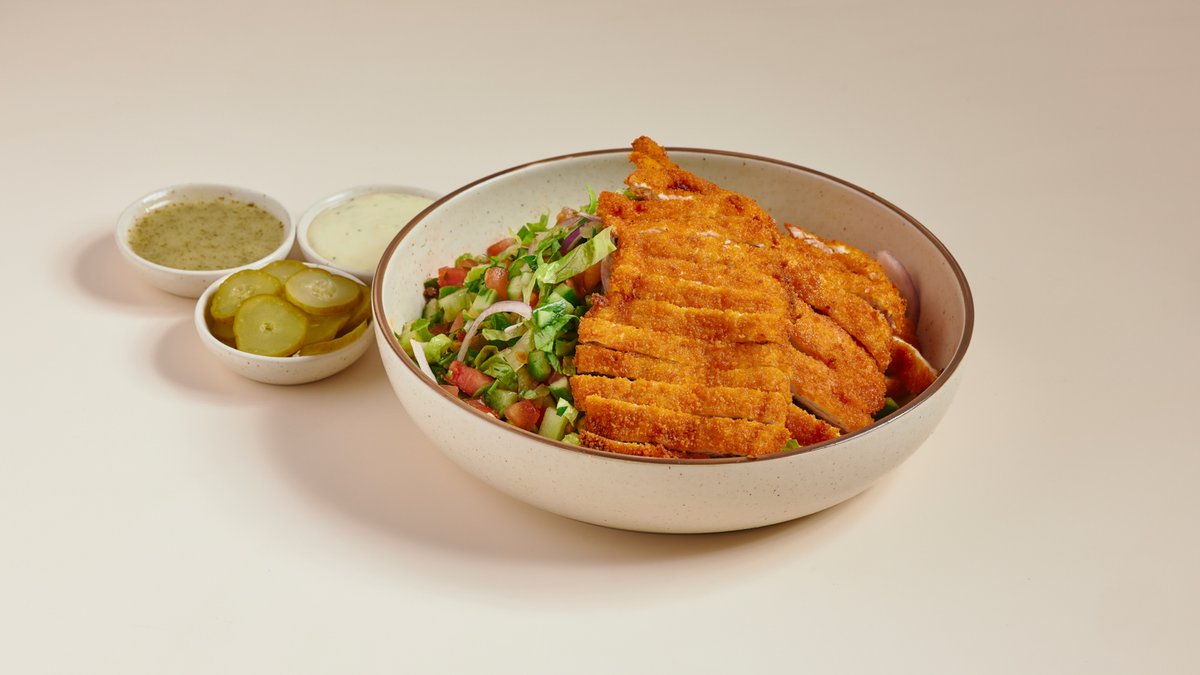 שניצל, מלפפון, עגבניה, תערובת ירוקים, בצל סגול ומעט פלפל חריף