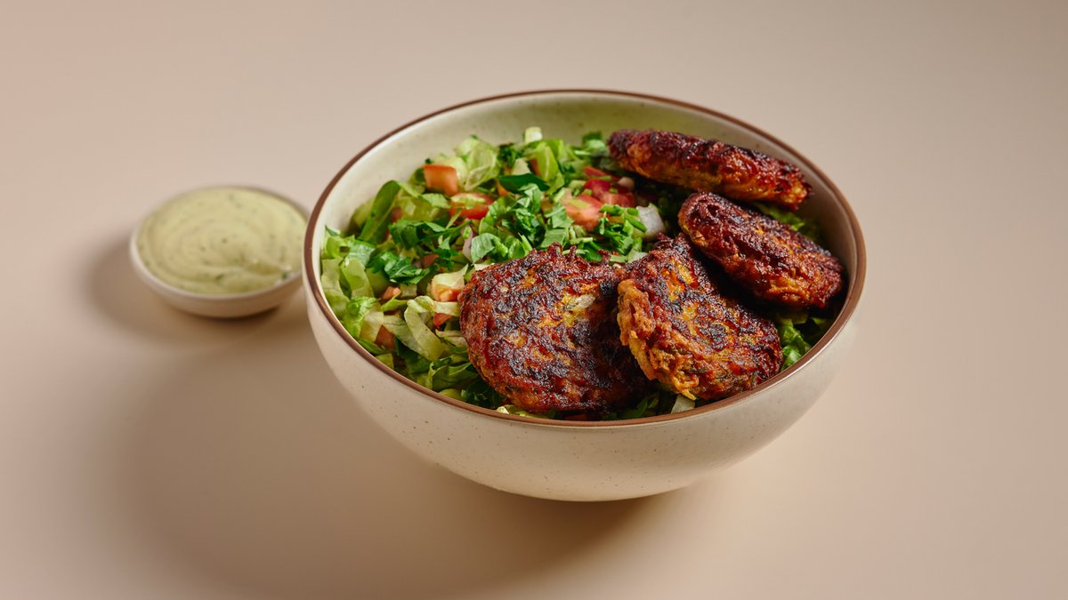 קציצות ירק, מלפפון, עגבניה, תערובת ירוקים, בצל סגול ומעט פלפל חריף
